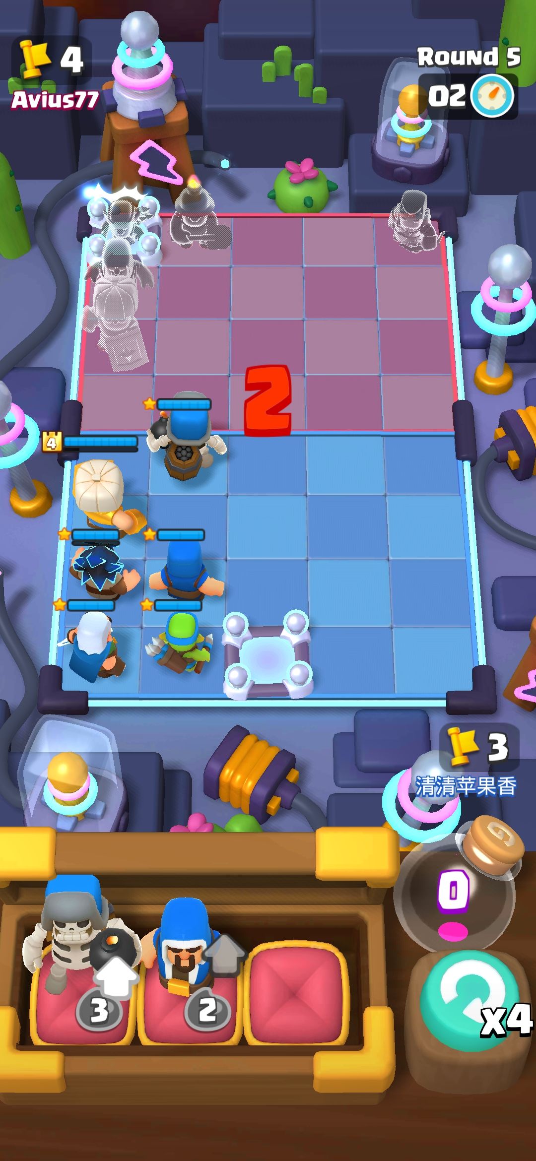 推荐个配置 配兵站位等级如图 全员一星即可 优先升电法和炸弹骷髅 站位左右镜像每回合一换 简单粗暴 遇到有投石的可以适当调整一下 buff位置比较好的可以吃下不必硬吃