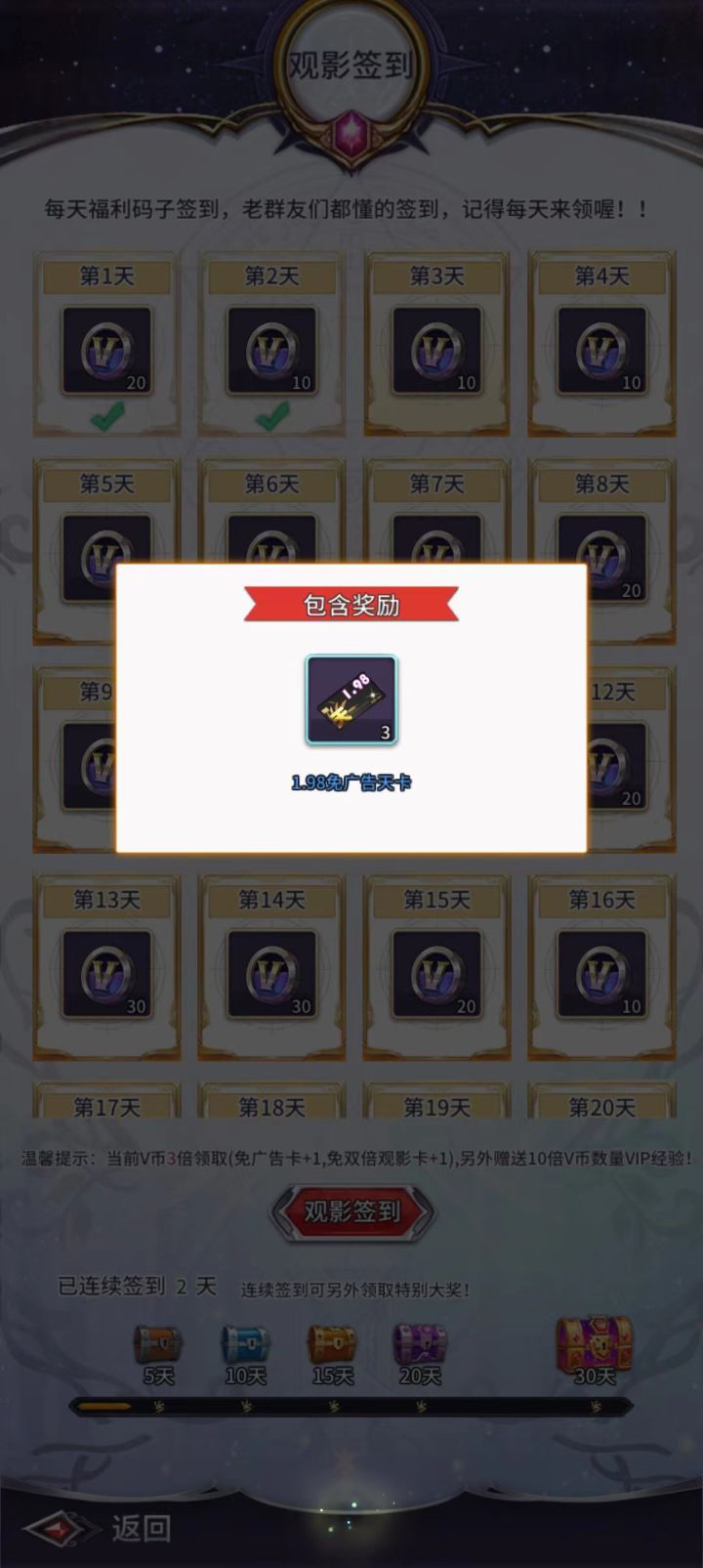先送上两个 永久特殊福利码为敬:vip666vip8881 .《新来的大大福利码子开局指南》,Tap帖子传送门:2 . 《福利加强版本全攻略》,Tap帖子传送门:介绍一个游戏中的免广告怎么领取!普及一个概念哈:同时拥有免广告卡和免双倍观影广告卡,我们这边俗称“双免卡”。1、观影签到,我们老群友们都懂的签到。底部宝箱,坚持每天签到,等待一定天数,可以领取免广告天卡和免广告周卡2、活