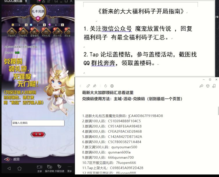 Hello,各位大大: 奔奔整了个福利开局视频,有兴趣的大大 可以看看:1.关注微信公众号 魔宠放置传说 ,回复 福利码子 有最全福利码子汇总。公众号二维码:2.Tap论坛盖楼贴,参与盖楼活动,截图找QQ群找奔奔,领取盖楼码。盖楼贴传送门: 3.游戏内每日最多领取648V和免广告卡 福利加强版本全攻略: 传送门:4.最全福利码子汇总(持续更新贴。。。。) 传送门: