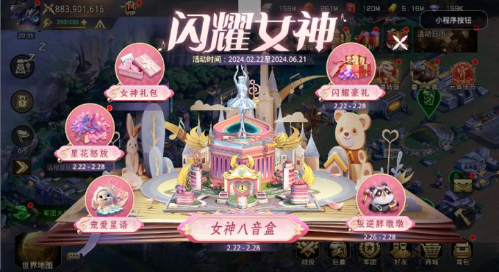 女神节即将到来,【巨兽战场】在此提前祝大家女神节快乐。女神节期间,游戏内也为大家准备了满满的福利,今天就由小艾为大家带来新春活动的详细介绍!首先为大家介绍女神节活动,本次女神节活动共分为六大主题,活动入口的主题色是浪漫少女粉和可爱猛男粉,小艾的少女心被狠狠的戳动了,谁不喜欢甜甜的温柔粉呀。话不多说,接下来就让小艾给大家一一介绍吧!一、女神八音盒1.占领等级: a.活动期间,可提交【音符】获