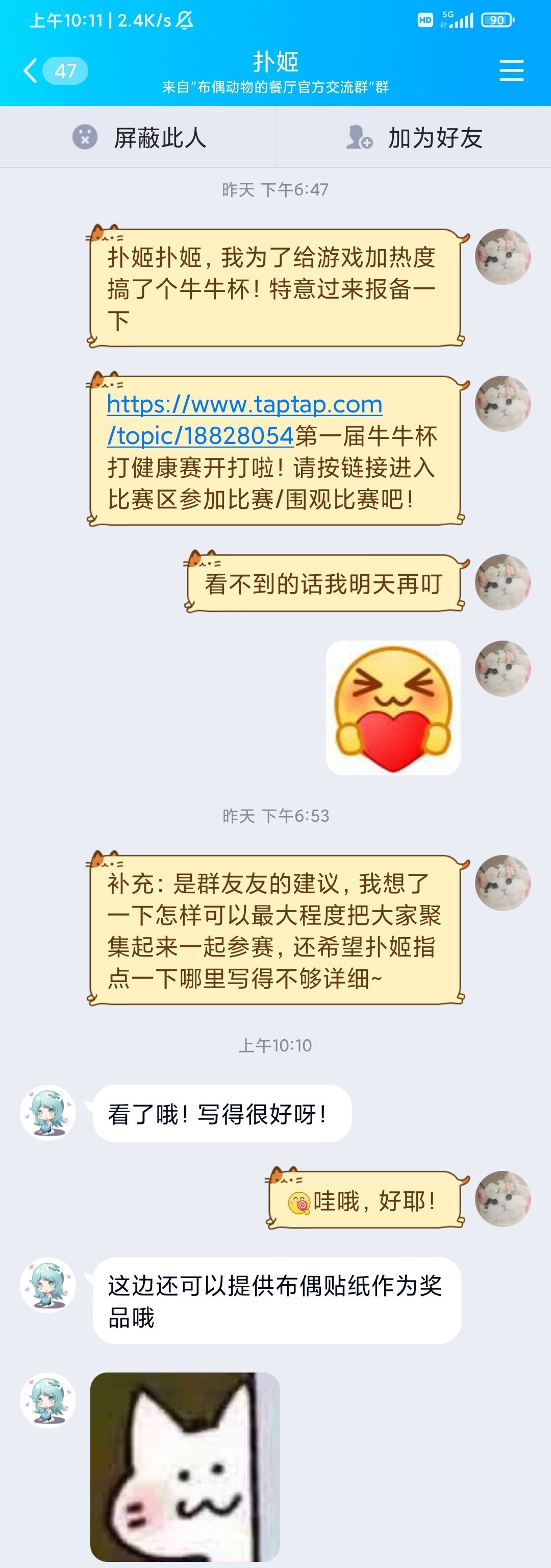报——重大利好消息!牛牛杯已经通过官方报备,官方决定加码礼品!是精美的布偶贴纸哦~~~大家可以期待一下 ——以下正文 来自群友友提议:因为好多人都挖到了牛牛(有好多人没有抢跑导致现在被卡崩了拿不到,不是我关了哦!房间码ZM8JZL14A),所以不如来个搞个牛牛杯打健康食谱! (图一:一定要用这个suushi指定专用的玩偶嘿白白!不然无法取得比赛资格哦!) 好主意!我想了一下,觉得拿到牛牛的想参赛的