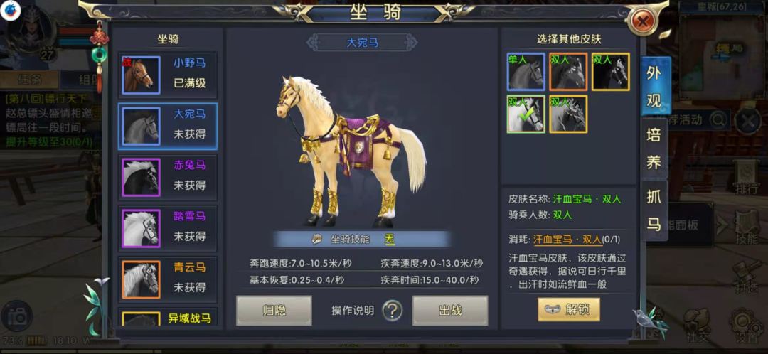 潇洒的江湖必然不能只靠双腿成就,有一匹好的坐骑能助你潇洒驰骋,还在为没有高级坐骑苦恼吗? 亲情奉献永久汗血宝马获得攻略 要想得到汗血宝马,少不了汗血宝马牌。 它是奇遇任务获得,奇遇任务每个人都可以完成,一分钱都不用花 奇遇任务:古墓之谜、青山旧事、大内奇案、千年鱼王、君子好逑、井中捞月,完成后可获得汗血宝马牌。 如果你凑齐了六个汗血宝马牌子,那么,去找奇遇商人吧,通过奇遇商人,就可以兑换汗血宝马了