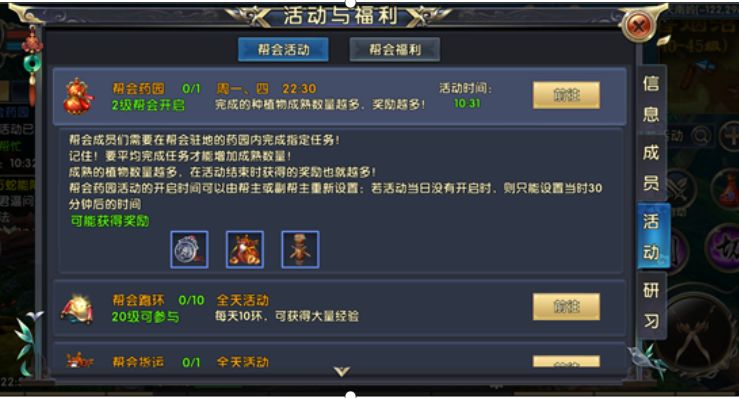 要想参与帮会药园活动,首先需要玩家达到20级后,并在帮会等级提升到2级之后才能加入帮会开启玩法。活动开始时间为每周一、周四晚上22:30,持续时间为半小时。帮会成员们需要在帮会驻地的药园内完成指定任务,任务完成的次数越多,成熟植物的数量也会越多,在活动结束时获得的奖励也就越多。那么究竟具体要完成哪些任务呢,接下来请看详细的参与流程。 抓贼 药园活动一共分为四个小任务,第一个是抓贼。玩家可在药园中央