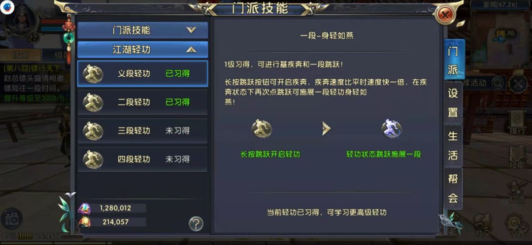 游戏中最最最最最让人期待的应该就属轻功玩法了,身轻如燕飘逸灵动的轻功身法绝对会给你一种绝世高手的感觉,不过轻功不是生来就会的,学习轻功需要完成四个阶段的任务~ 游戏初始就给玩家配备了一段轻功身轻如燕,玩家长按跳跃按钮即可开启轻功,这里也不一一细说了,反正很简单 之后玩家在达到20级后即可开启轻功二段踏雪无痕,玩家可以在技能系统中找到轻功,点击任务指引找到位于桃花谷区域翠竹谷处的逍遥子,就可以开始二