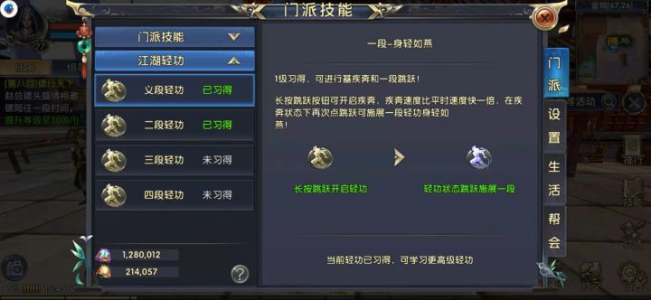 游戏中最最最最最让人期待的应该就属轻功玩法了,身轻如燕飘逸灵动的轻功身法绝对会给你一种绝世高手的感觉,不过轻功不是生来就会的,学习轻功需要完成四个阶段的任务~游戏初始就给玩家配备了一段轻功身轻如燕,玩家长按跳跃按钮即可开启轻功,这里也不一一细说了,反正很简单之后玩家在达到20级后即可开启轻功二段踏雪无痕,玩家可以在技能系统中找到轻功,点击任务指引找到位于桃花谷区域翠竹谷处的逍遥子,就可以开始二