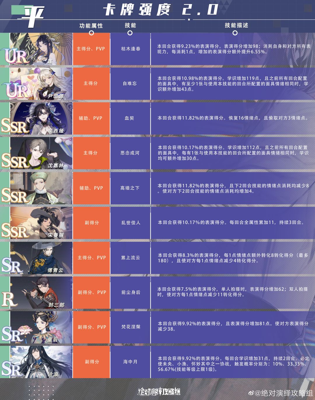 ⭕前期仓管,后期发力的笨蛋美人💓,技能效果为本回合恢复一定情绪点与上限,且每回合初情绪点低于上限的50%则立即恢复一定情绪点,最多恢复两次,若最后