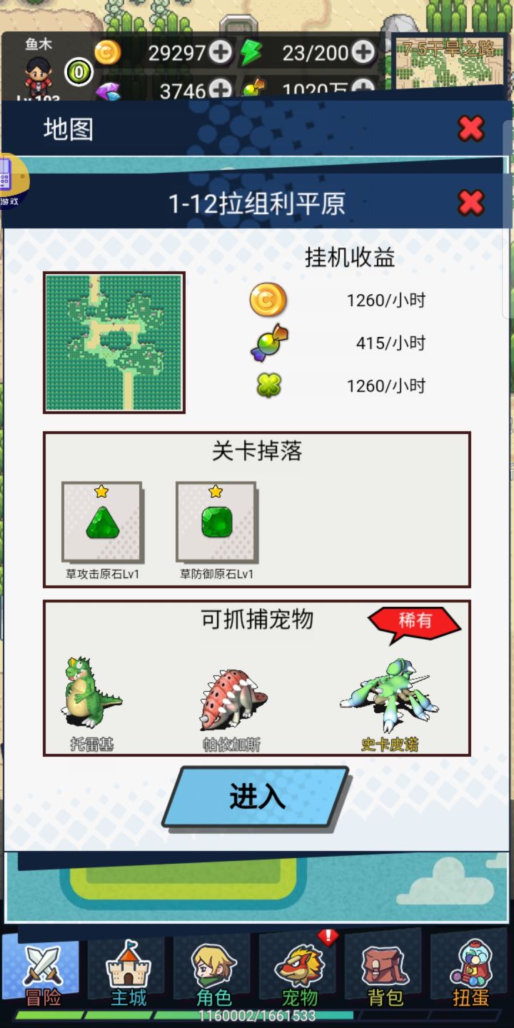 大家好,第一次写攻略,欢迎大家多留言给建议主要给大家介绍一下宠物捕捉的心得,第二天玩刚推完5-22,这游戏S宠主要分布在每个大关卡的12和22小关。下面就为大家提供S宠分布的关卡明细:【1-22】科尔顿种族值:545属性:一般+妖精【1-22】巴朵奈特种族值:555属性:幽灵【2-12】左迪洛斯种族值:560属性:水+恶【2-22】巴朵兰恩种族值:560属性:火+地面【3