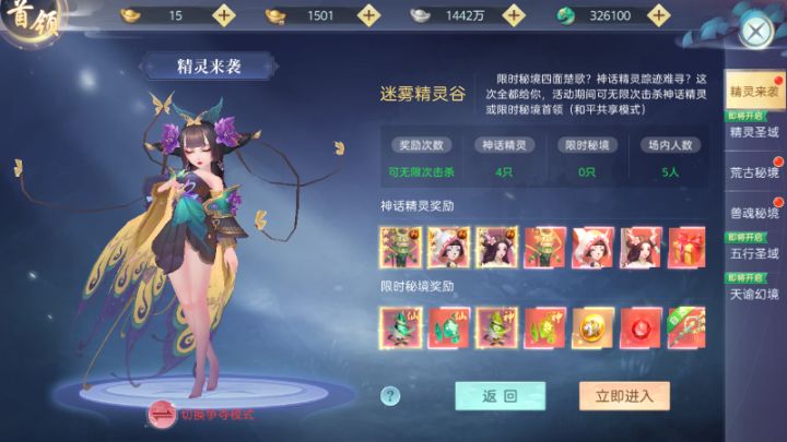 1、迷雾精灵谷(和平)在每日12:00/ 14:00/16:00/23:00时段开放2、首领分为限时秘境和神话精灵两种类型,活动期间可无限次击杀3、场景内为和平共享模式,参加击杀就可获得相同奖励,无需担心被抢1、迷雾精灵谷(争夺)在每日12:00/14:00/16:00/23:00时段开放2、首领为限时秘境+神话精灵奖励二合, 活动期间可无限次击杀3、场景内不限制战斗模式,只有归属者才能