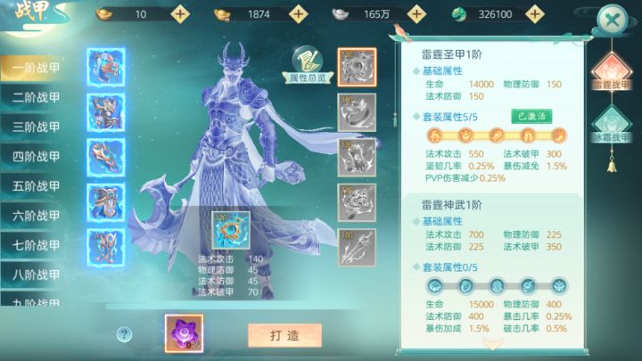 1、雷霆战甲一共10个部位,左侧5个为圣甲部位,右侧5个为神武部位2、同一阶的5个圣甲部位/神武部位都打造完毕,还能激活强力的套装属性3、打造高阶圣甲与神武部位时,额外需要消耗高级材料,建议市场收购高级材料4、需要先打造完毕,上一阶的圣 甲套装/神武套装,才能打造下一阶5、不同阶数的圣甲与神武的基础属性和套装属性,同时生效