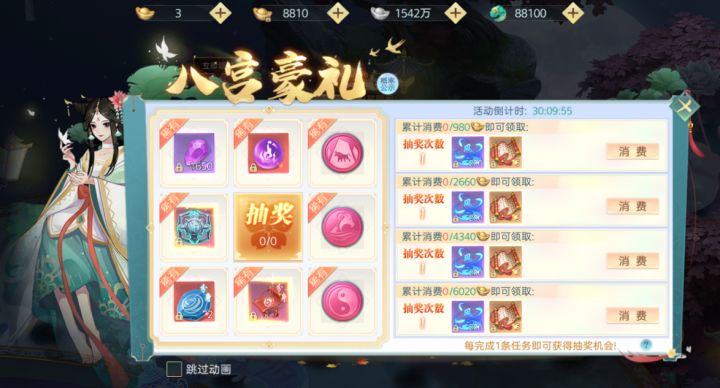 1.每完成1条任务即可获得抽奖机会,-轮最多8次抽奖机会。2.活动结束或者重置,次数不归零,任务奖励会通过邮件发送,但是不包括抽奖次数。3.累积消费可获得抽奖机会和高级物品。抽奖概率透明!非酋拯救计划!高级物品获得几率还是很高的哦!