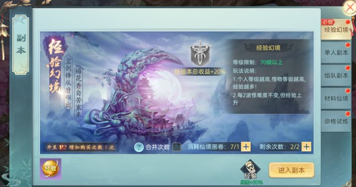 经验幻境宝剑锋从磨砺出,梅花香自苦寒来!经验幻境等级限制:在70级以上哦玩法说明:1.个人等级越高,怪物等级越高,经验越多!2.每2波怪难度不变,但经验上升。如果觉得一次一次刷麻烦的话可以合并次数一次性刷完所有机会哦~合并开启条件: 240级开启1.合并后只需要通关一次副本即可获得所有剩余次数的奖励2.并扣除所有的剩余次数