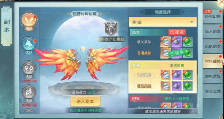 材料仙境副本分为翅膀才能进仙境、伙伴材料仙境、法座材料仙境、洗练材料仙境、心经材料仙境。每个仙境分为4层,每层分为3个难度,通关不同难度获得的奖励不同。每个难度首次通关可获得首通奖励。材料仙境是获得进阶升级材料的不二之选哦~