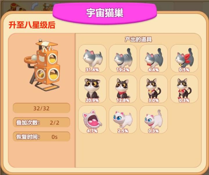 1.未升星时,可获得宇宙猫巢16次,猫巢产出产物概率如图;2.升至八星级,可获得宇宙猫巢32次,如图可查看升至八星级后,猫巢产物产出概率的变动。总结:凡升星后,生产道具产出低等级产物概率会降低,产出高等级产物概率会有所提升,另将新增数个全新产物。#游戏种草计划#攻略#游戏安利#游戏讨论#游戏推荐#游戏福利