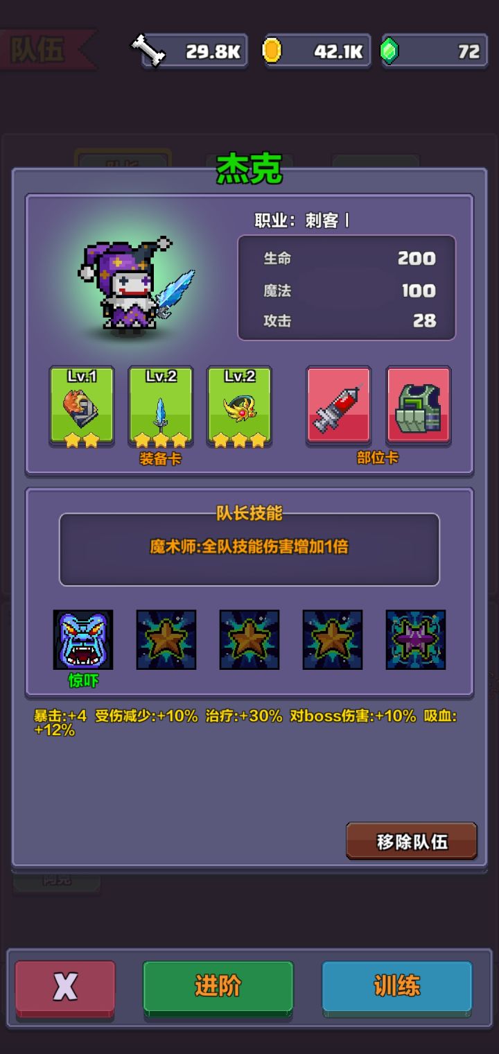 首先肯定,做的不错,但吸血哪有溢出的说法?我自己就测试过,可以超过100%,吸血比伤害还多。另外补充些东西死亡空间:6个小人都带 斩杀卡片一个都没就不要打了,累死你。小人全靠苟出2%x6boss会无限成长,可惜没卵用。五彩史莱姆:要在20回合里杀掉20只建议全上群攻带杰克队武器伤害类型,带技能加成的书和吸血的戒指卡片带 暗器和斩杀可惜这怪物成长也没个限制,到后期无论如何都打不过了。目前应该能打到到一百四五十级的怪,靠斩杀卡片了竞技场:这里全是设定好的ai,并非玩家主推控制+爆发,想磨死对方?不可能的。同样,对面也会越来越牛,能打到四五十层就知足吧,这个也要靠斩杀卡片