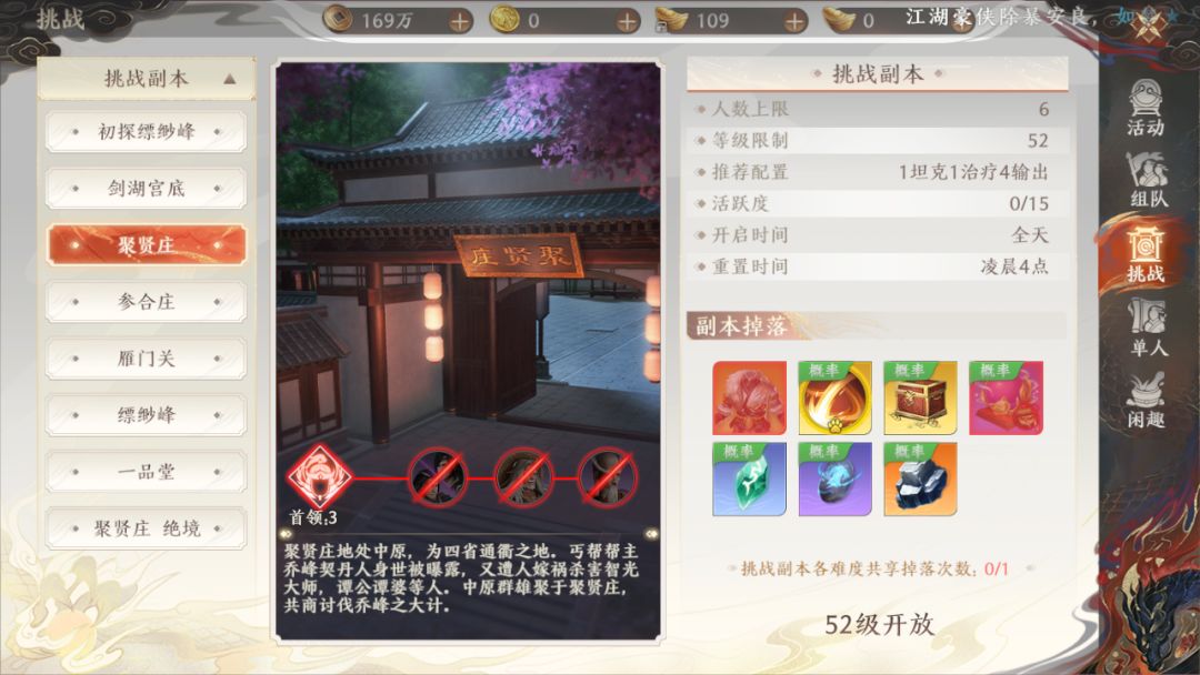 天山童姥坐拥缥缈峰,麾下强手云集。若要得见童姥,需先力战强敌!(副本需要至少一名少林或丐帮作为承伤者,一名峨眉作为治疗者,才能进行!) 1、副本介绍少侠可以点击【活动】-【挑战】打开副本界面,可以在副本界面查看副本的一些基本信息。 挑战副本各难度共享掉落次数。 参与条件:人数上限:6人 等级限制:30级 推荐配置:1坦克1治疗4输出 重置时间:凌晨4点 少侠可以点击【首领头像】可以查看首领主要技