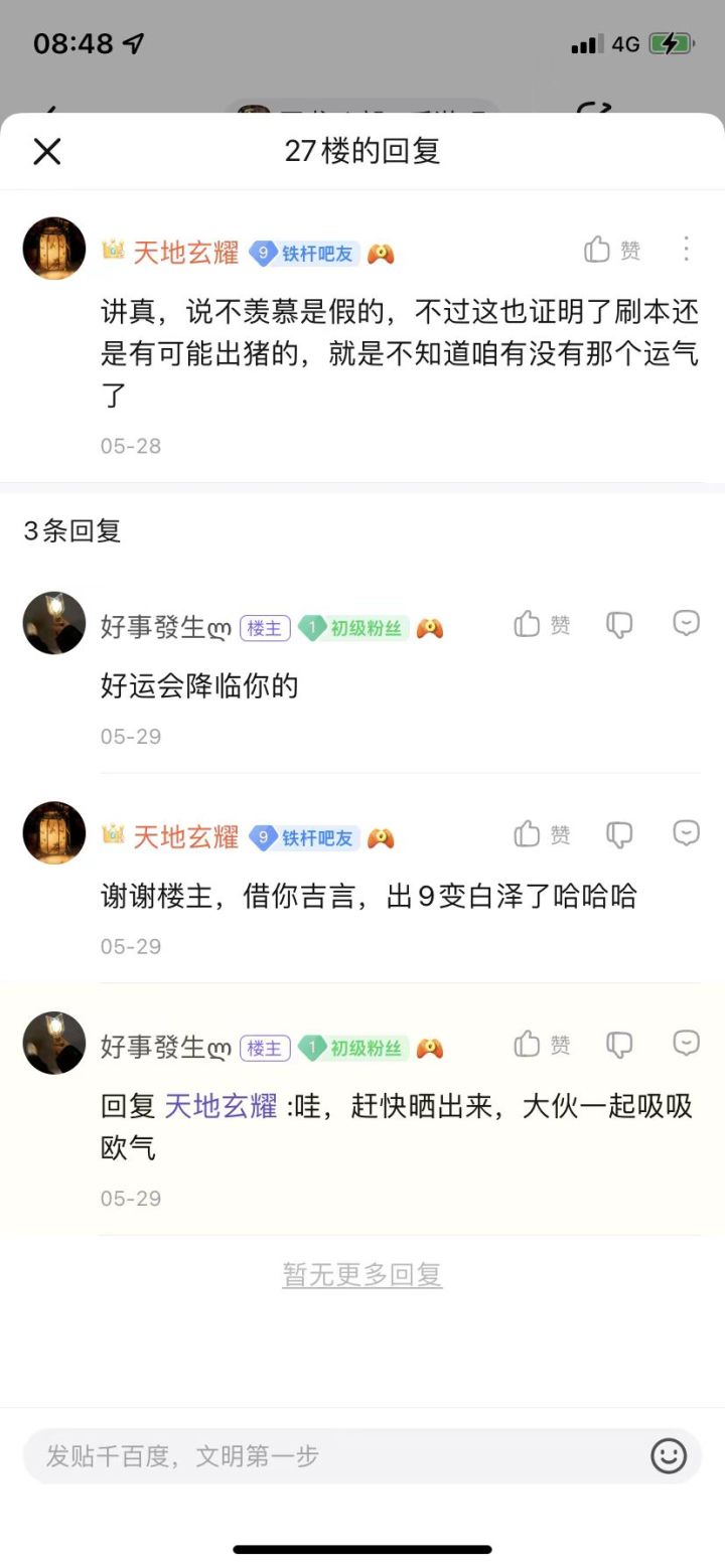 昨天逛贴吧发现有人运气爆棚刷挑战本出神兽猪了,一堆吧友在下面表示不可思议,都不知道是什么运气才可以出一只神兽猪,看了大家的评论以后我内心也很兴奋,而且也有感同身受的那种感觉,兴奋主要是因为刷挑战本真的有可能出神兽猪,那就代表我也有可能出。感同身受就是因为我在这条帖子底下回复了,然后楼主说“好运会降临你的”,真实借了吉言,前两天半夜出了9变白泽,让我欧气了一把,终于体验了一次不是非酋的感觉。其实