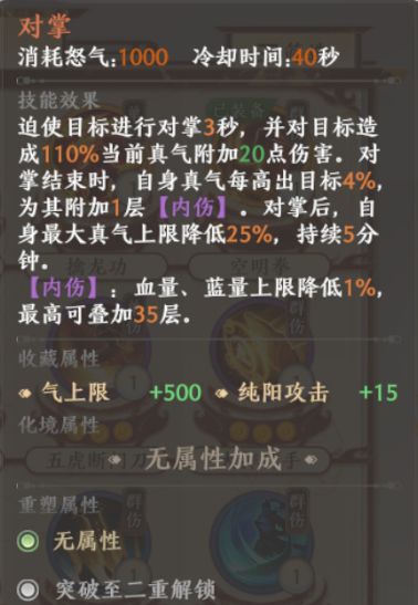 虽然对掌这个绝学我也有,但是我从来都没有用过它,也就没有研究他的玩法了,直到野外被几个恶心的人抓到轮流对掌后,颠覆我了我对这个游戏的认知。。。先说一下,这游戏蓝量也就是真气的提升只有等级和毅力属性可以增加,所以那天对我开杆的第一个大佬就是无尘,无尘的毅力属性成长,在这个游戏里是数一数二的,所以一般职业和无尘对掌基本上没有胜算,另外我怀疑他还是主点的毅力,对掌后直接35层内伤,后面的就是各种被小弟