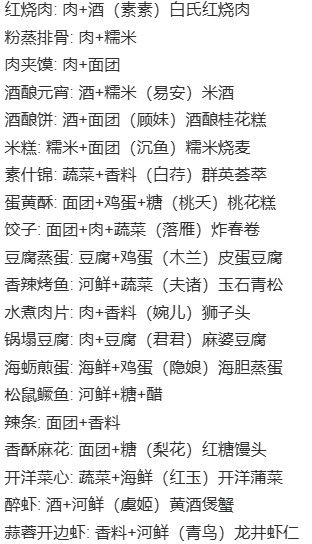 桃花糕:鸡蛋+面团+糖需选#桃夭研究 蛋黄酥:鸡蛋+面团+糖 素什锦:蔬菜+香料 群英荟萃:蔬菜+香料需选白荇研究 饺子:面团+肉+蔬菜 豆腐蒸蛋:豆腐+蛋 香辣烤鱼:河鲜+蔬菜 水煮肉片:肉+香料 锅塌豆腐:肉+豆腐 海砺煎:海鲜+蛋 松鼠鳜鱼:河鲜+糖+醋 辣条:面团+香料