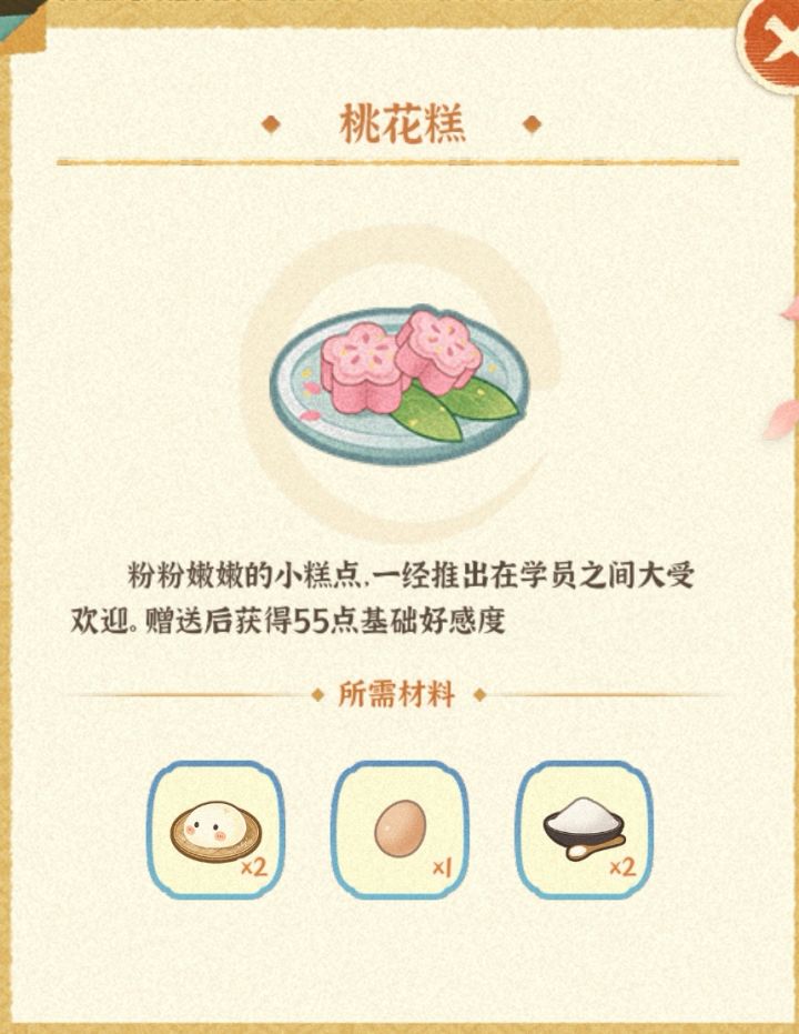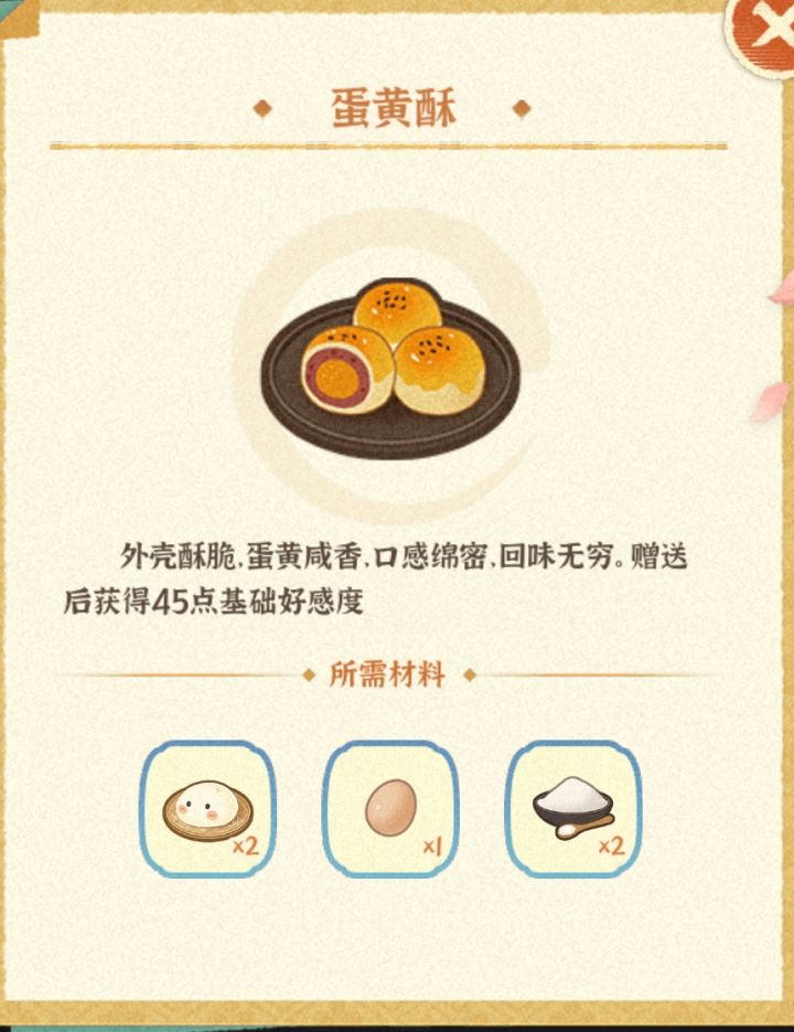 桃花糕:鸡蛋+面团+糖需选#桃夭研究 蛋黄酥:鸡蛋+面团+糖 素什锦:蔬菜+香料 群英荟萃:蔬菜+香料需选白荇研究 饺子:面团+肉+蔬菜豆腐蒸蛋:豆腐+蛋香辣烤鱼:河鲜+蔬菜水煮肉片:肉+香料锅塌豆腐:肉+豆腐海砺煎:海鲜+蛋松鼠鳜鱼:河鲜+糖+醋辣条:面团+香料
