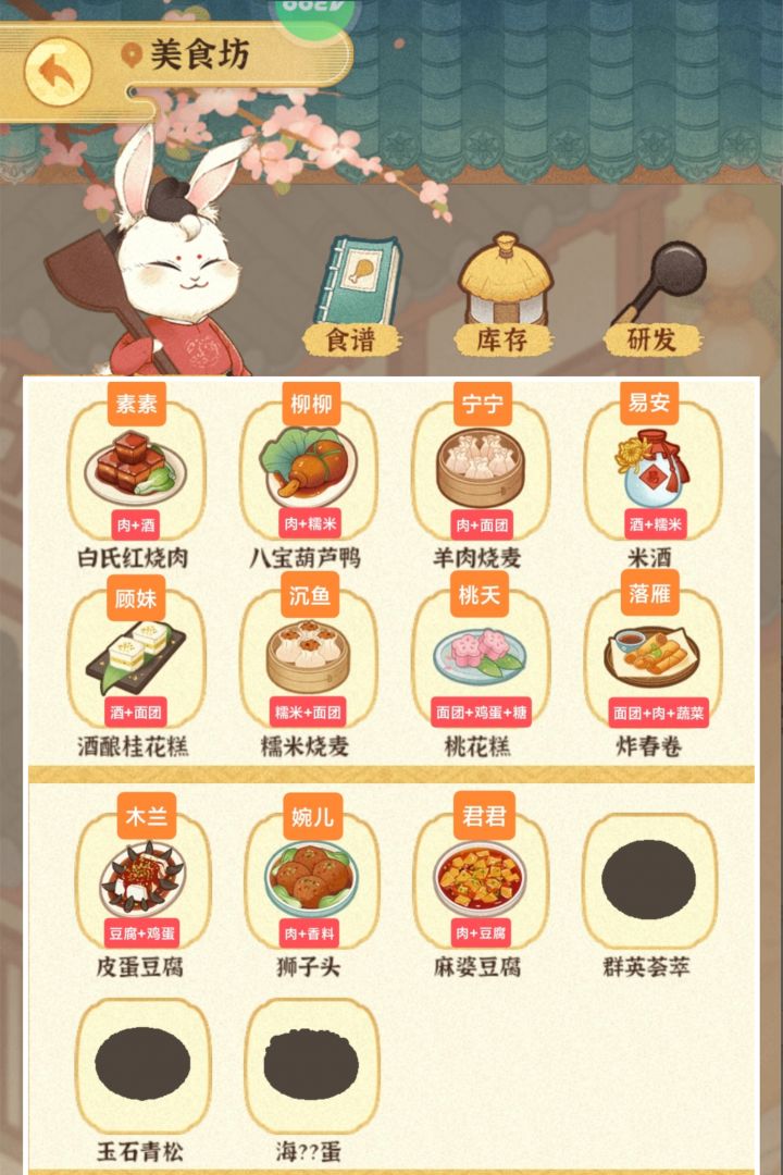 一,菜谱(******代表普通菜谱没有对应的特殊菜谱)红烧肉 肉+酒白氏红烧肉 素素+肉+酒粉蒸排骨 肉+糯米八宝葫芦鸭 柳柳+肉+糯米肉夹馍 肉+面团羊肉烧麦 宁宁+肉+面团酒酿元宵 酒+糯米米酒 易安+酒+糯米酒酿饼 酒+面酒酿桂花糕 顾妹+酒+面米糕 米+面团糯米烧麦 沉鱼+米+面团素什锦 蔬菜+香料群英荟萃 白荇+蔬菜+香料蛋黄酥 面+鸡蛋+糖桃花糕 桃夭+