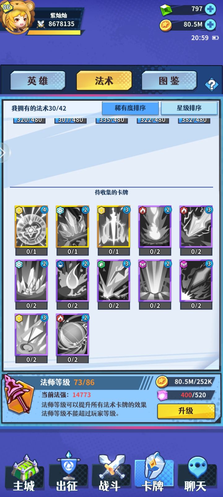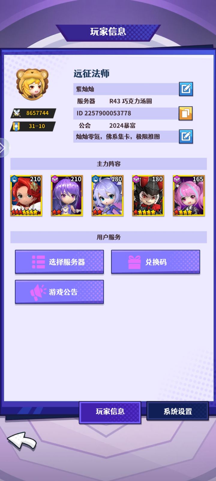 灿灿零氪,佛系集卡,极限推图。首先说一个前提,R43和44区享受了开区扭蛋维护补偿的10个四系自选箱子+100抽扭蛋抽抽。一,进度。主线13天31章,本来想说的是等推到30章的时候发,结果从29推到31了…………想一想以前R15区伍池号的22天30章进度,吃完了整个春节福利(春节福利肯定是碾压R43区的),但进度依然落后差不多10天,这就是版本更新和技术更新的力量,主要是技术更新,嘿嘿嘿……二