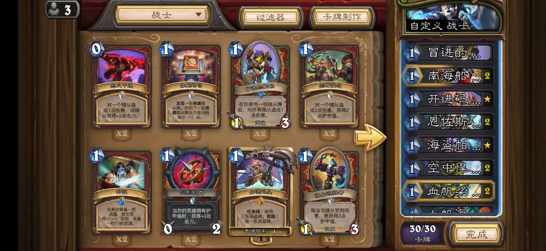 今天看见很多小伙伴在讨论卡组便宜又厉害,给大家推荐一套,先发个图,平平无奇海盗战。三张橙卡,目前战绩20局16胜上传说,只输了4局。 说一下思路,前期留低费海盗,2费的海盗可以不被从手牌拉出去,直接扔出去做任务。一定要6费之前做完任务,并且最迟六费拍下去任务卡。基本狂野目前的速度没人打得过,吹黑眼术的就别看了,这套卡吊着打。直接抢血,术士没办法做任务。本人常年混迹于国服前200的术士玩家,这套卡版