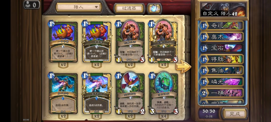 ### 自定义 猎人42 # 职业:猎人 # 模式:标准模式 # 天马年 # # 1x (1) 奇迹推销员 # 1x (1) 奥术射击 # 1x (1) 宝石鹦鹉 # 1x (1) 得胜的维库人 # 1x (1) 焦油泥浆怪 # 1x (1) 磷光射击 # 1x (2) 一桶欢猢 # 1x (2) 宽檐高帽 # 1x (2) 年轻的酒仙 # 1x (2) 拼布好朋友 # 1x (2) 沙龙酒仙 #