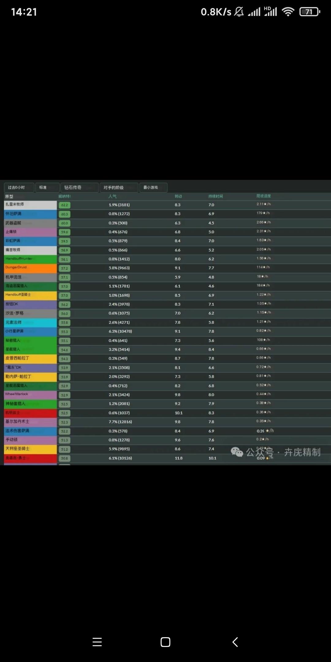 炉石藏漫斋 字数限制严重,喜欢炉石的老铁可以关注我公众号,老办法,具体代码评论区见吧。 天梯一直在变化,我取样时间仍为最近的6小时标准天梯钻石到传说分段。为什么不找传说分段,不同分段选手和卡组差异极大,所以不是登顶卡组适合在该分段,要看环境,好了我先放当前最新环境状况。 废话不要多说,听我你上传说!翻译就算了,我的免费次数用光了,我争取下班前做完这期。牧师仍然保持霸主地位(当前分段),其它职业