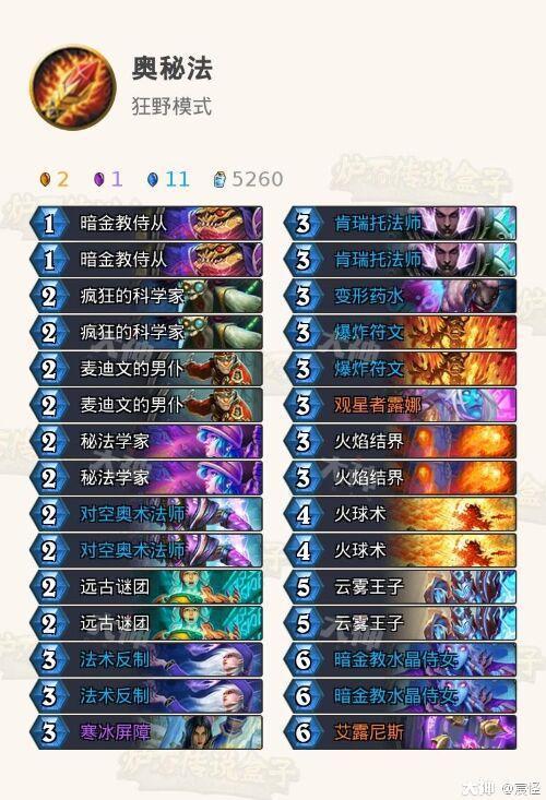大家好,我是宸怪。不久前我在每日炉石里搬运过一套狂野奥秘法,卡组来源是营地用户江流滚滚续向前。这套牌使用起来十分顺滑,对局也是势如破竹,连战连胜,不得不说奥秘法仍然是狂野的霸主之一。让我们来看一下卡组。 卡组代码:AAEBAY0WBMAB2bsCotMC7vYCDXG7AuwF9w3XtgLrugKHvQLBwQKP0wK+pAO/pAPdqQP0qwMA 单卡解析: 远古谜团 过牌+0费,为奥秘