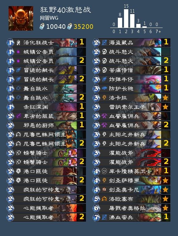 首先说一下使用原因,本意只是想测试下补丁后40卡构筑的激怒战强度,看看与传统30卡构筑区别如何,没想到实际使用情况还不错,10颗星从青铜10开打,全程用40激怒战以68局47胜21负(胜率69%)战绩打上传说。至于标题的由来会在下文当前环境分析中提到,现在暂时先按下不表。 卡组构筑、传说截图、对局截图如下: 代码: AAEBAQcQHPsM+g7fxAK6zgKrtgPAuQOcuwPR0QP76