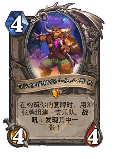 新卡新机制科普 由于狂野玩家普遍是老人,这里只简单介绍一些比较重要、常用的新机制卡: 1、乐队经理精英牛头人酋长俗称“牛”、“牛牛”)可以让你在构筑卡组时额外把三张牌塞入这张卡中,当你打出牛牛时,就可从你放进去的三张牌中选一张加入手牌。 这三张牌遵循单卡最大投入限制(2张),也遵循死亡骑士符文限制,遵循游客机制限制。但这三张牌不遵循奇偶数限制——你可以偶数战带牛牛,牛牛里面携带奇数牌;也不遵循黑暗