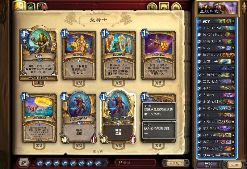 在卡牌大师抄的卡组,自己改了几张 卡组如下: ### 圣契骑 # 职业:圣骑士 # 模式:狂野模式 # # 2x (0) 适者生存 # 2x (1) 圣礼骑士 # 2x (1) 奥尔多侍从 # 2x (1) 智慧祝福 # 2x (1) 水晶学 # 2x (1) 神圣佳酿 # 2x (2) 星际研究员 # 2x (2) 智慧圣契 # 2x (3) 斩星巨刃 # 2x (3) 明澈圣契 # 2x (3