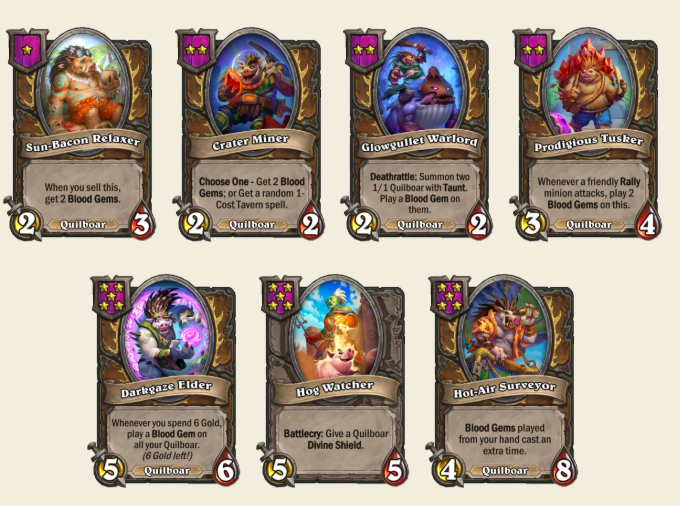 酒馆版本:第九赛季 已更新所有种族: 野兽、龙、野猪人、海盗、纳迦、机械、鱼人、恶魔、亡灵、元素。 作图不易,使用素材,请标明转载出处哦