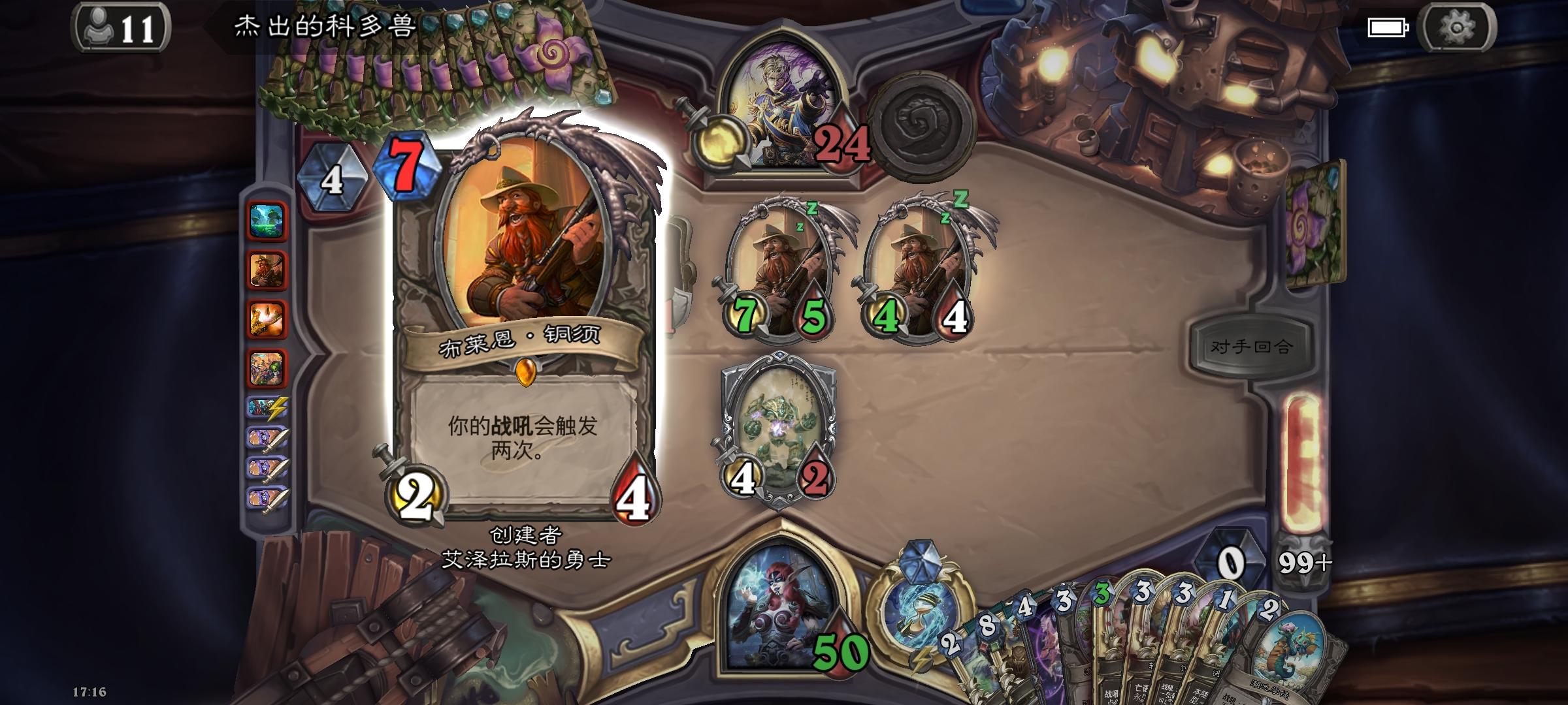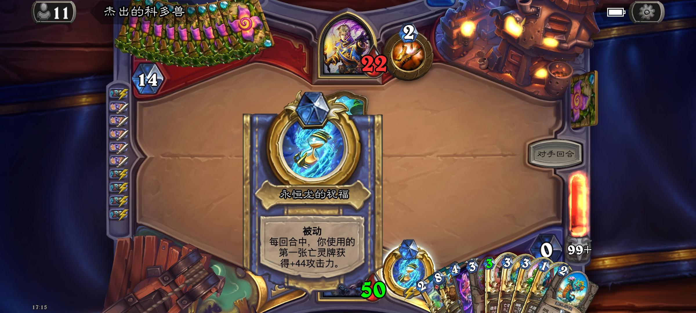 对面火球牧满月后每回合依然要花最起码7费去下随从,我50多血他压根没法用火球+7费大法师的康巴结束游戏。灌注了四五十次后对方只能被我200攻的冲锋大哥一脚抬走。