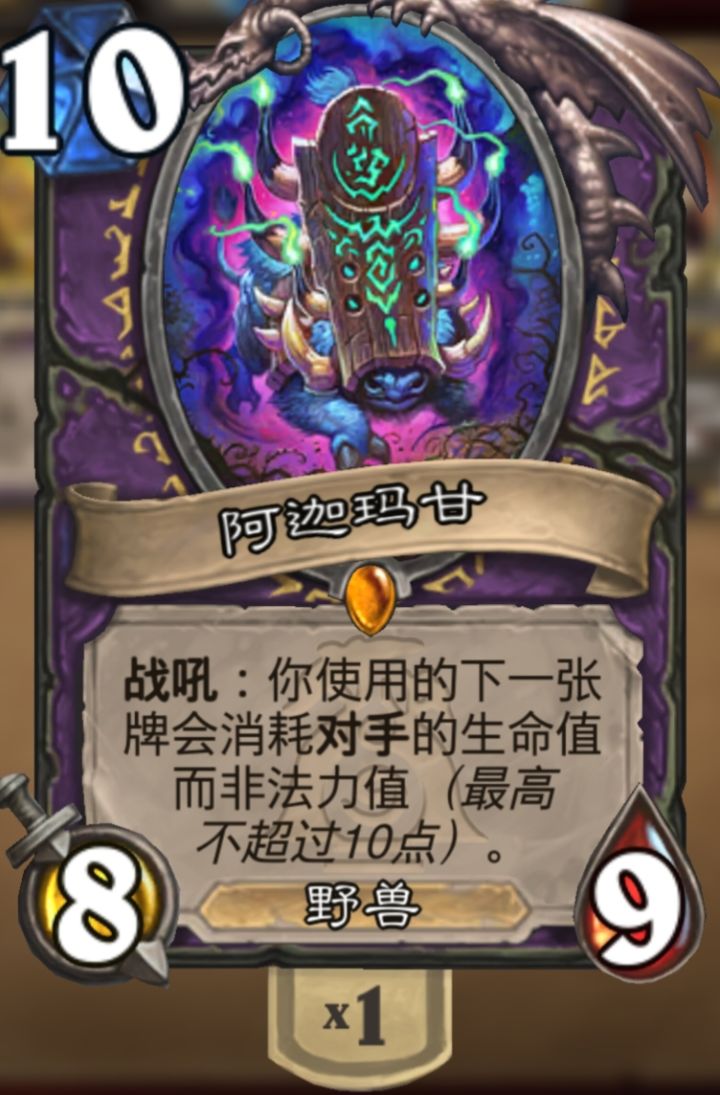 钻石卡末世的姆诺兹多给你两个回合又怎样你没有下个回合了就让你尝尝我钻石卡的厉害只要能回手弃掉的古加尔,利用效果就能将本局弃掉的所有卡回手,包括他自己,而古加尔回手的卡消毫血量而非费用,加上阿迦玛甘使下一张卡消毫对手血量所以You jump,I jump.最后用钻石卡回血续命,扭曲虚空清面板,于是就有这么一套能无限OTK的卡组。