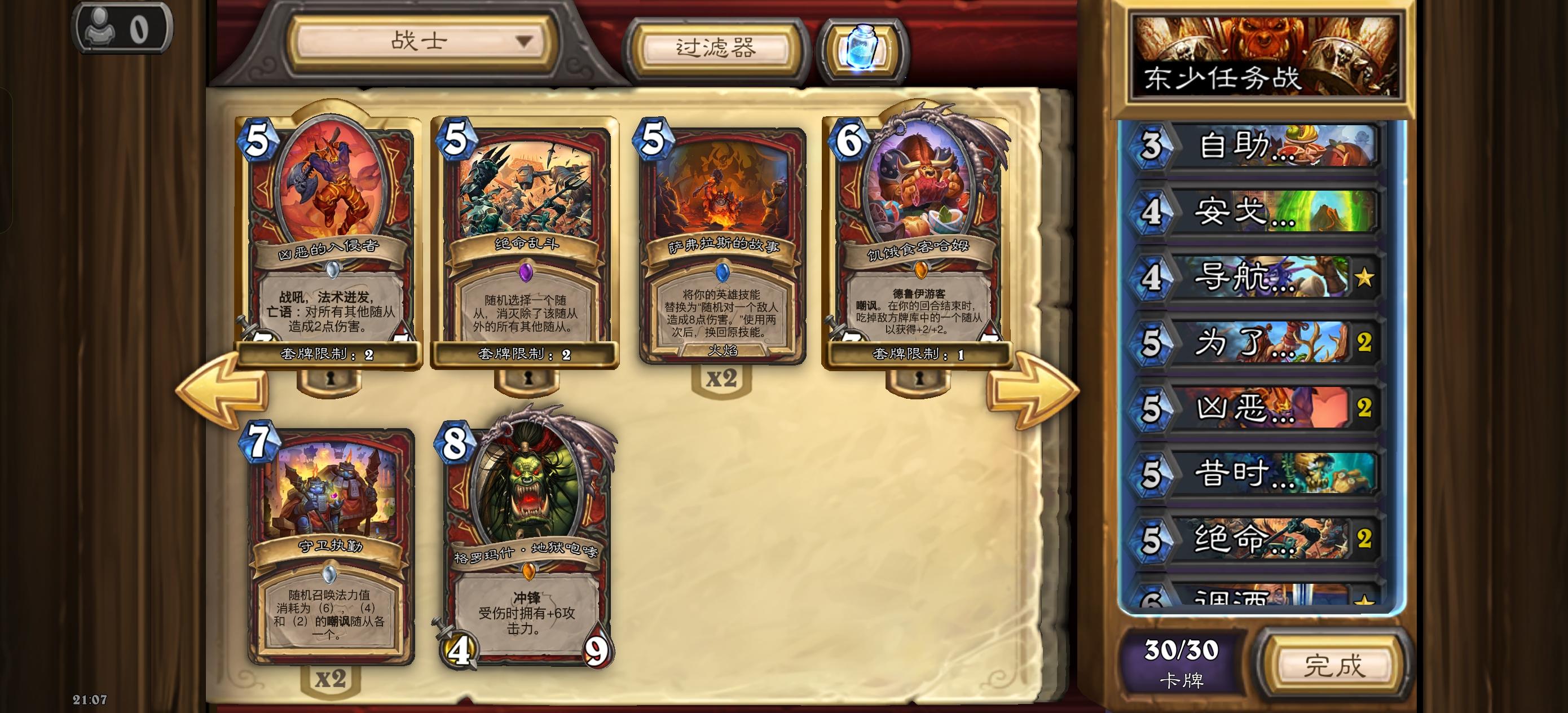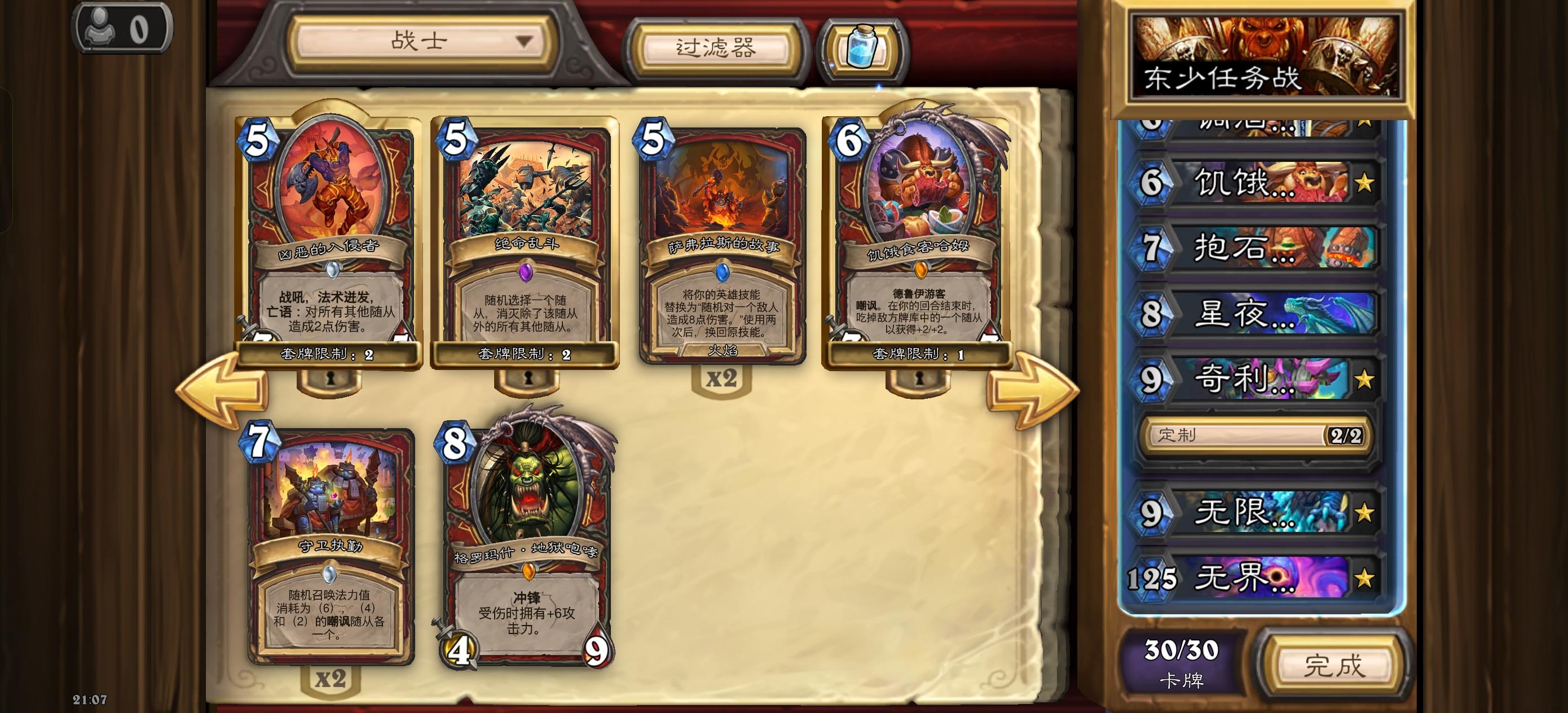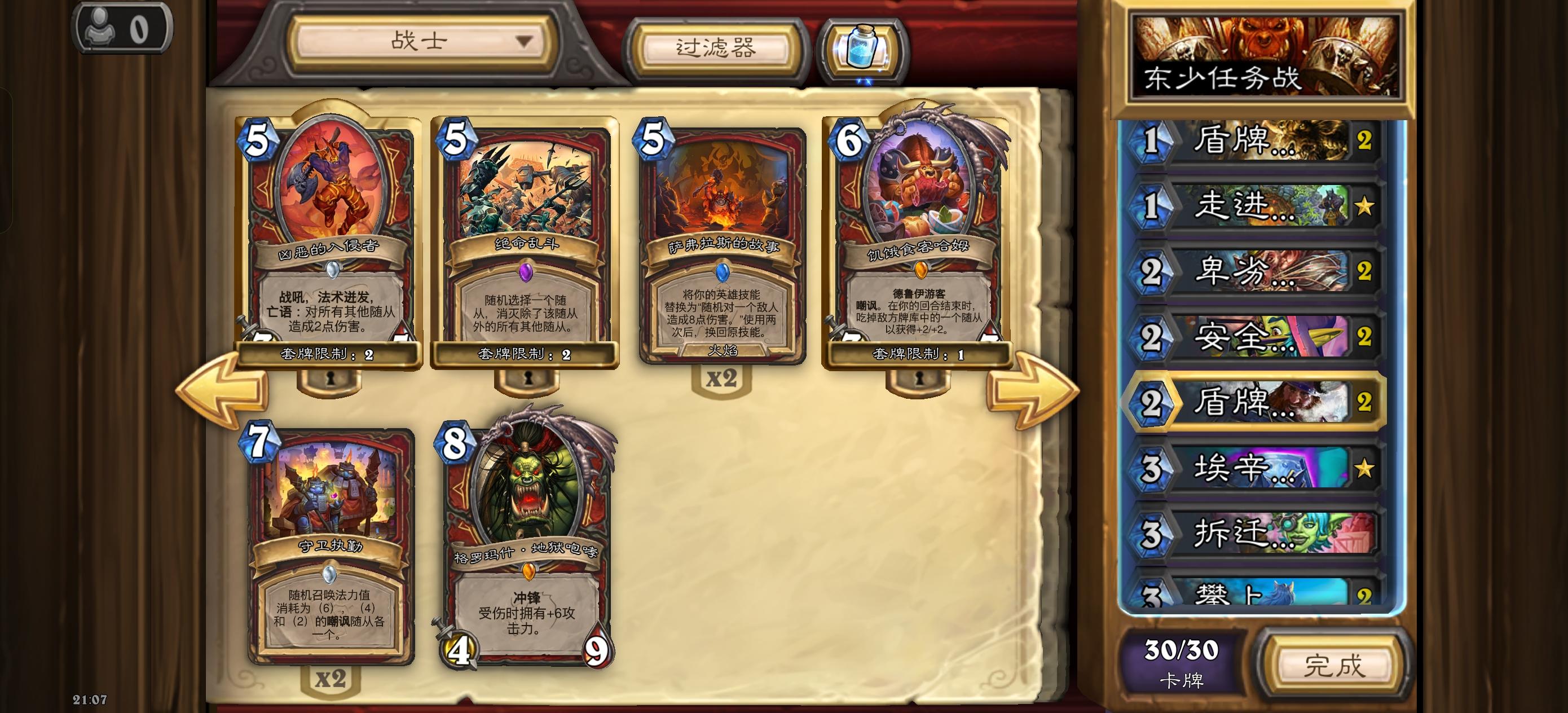 ### 东少任务战# 职业:战士# 模式:标准模式# 迅猛龙年## 2x (1) 盾牌猛击# 1x (1) 走进失落之城# 2x (2) 卑劣的脏鼠# 2x (2) 安全护目镜# 2x (2) 盾牌格挡# 1x (3) 埃辛诺斯壁垒# 1x (3) 拆迁修理工# 2x (3) 攀上新高# 1x (3) 自助大餐# 1x (4) 安戈洛宣传单# 1x (4) 导航员伊莉