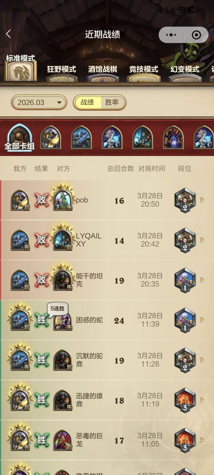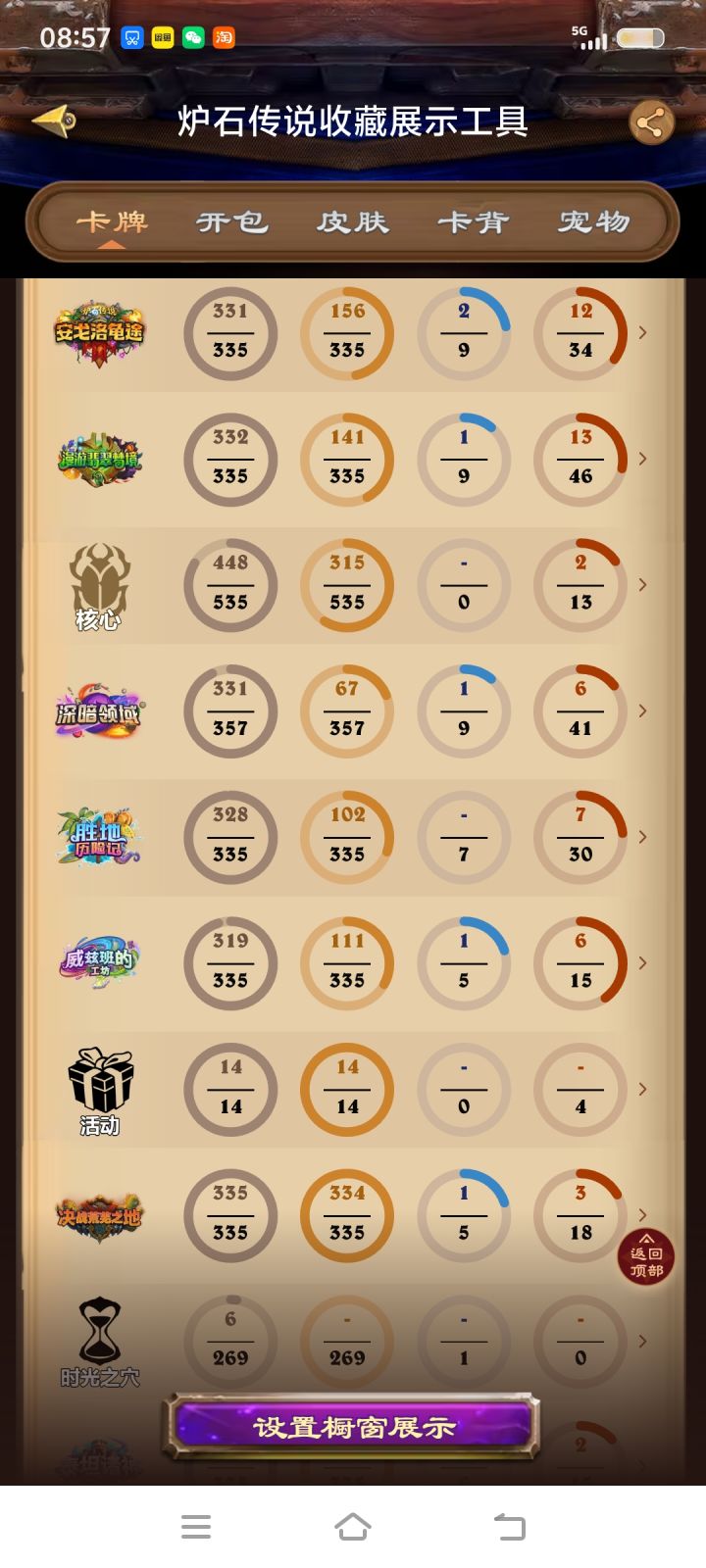 王牌猎人怎么可能没有,这可是我上学时期最喜欢的版本。从数据可看出我是勇闯安格洛退坑(毕业了)直至国服回归才重新玩,我目前有3万多橙,4万4金币,新版本卡基本都齐的,玩狂野出了做卡组以外还有什么补的建议吗(冒险模式已经全买了,只是还没有打)