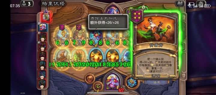 哦呼呼,看看我发现了什么有意思的东西。海上双雄的塑造法术,每一张都是单独触发的,新机械随从堕落的飞天魔像,每触发一次亡语,便获得一次身材无论在哪里。这导致火妖所记住的所有海上双雄法术都对其生效,这还真是意想不到的惊喜。涨得竟然比我养的还快,没这张还真被人带走了。