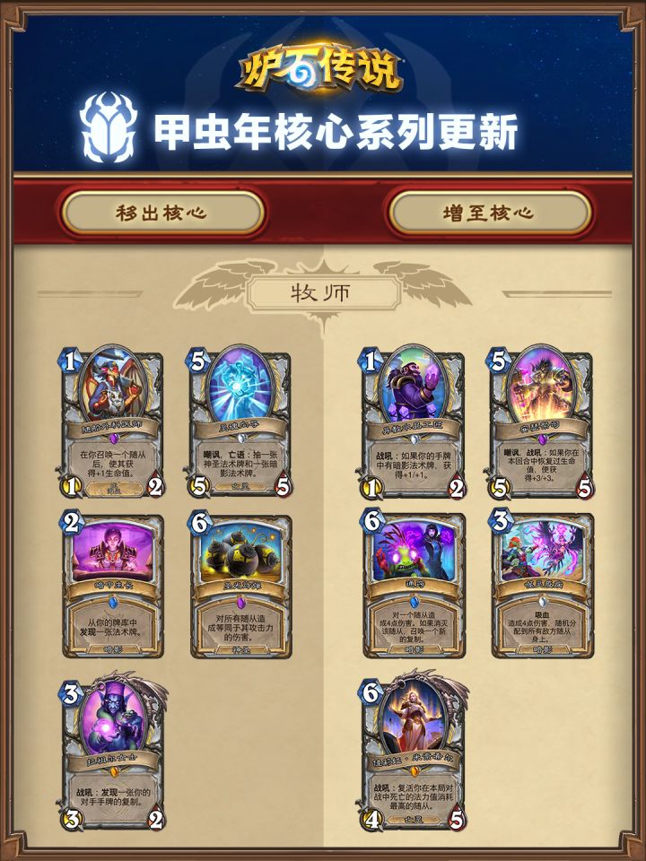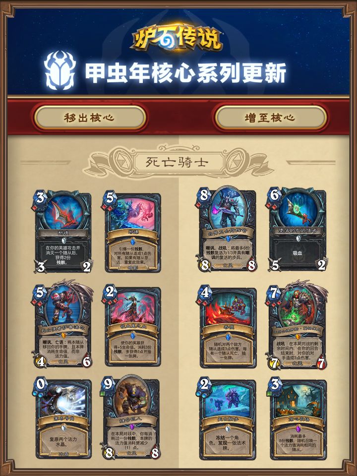时空中的《炉石传说》钟盘再次鸣响,新一年的倒计时已近在咫尺。让我们共同倒计时,迎接甲虫年的开启! 核心系列卡牌即将轮换,您可以点击下方图片查看具体变动信息,这些变动将随下一个扩展包上线同步生效。 #炉石传说