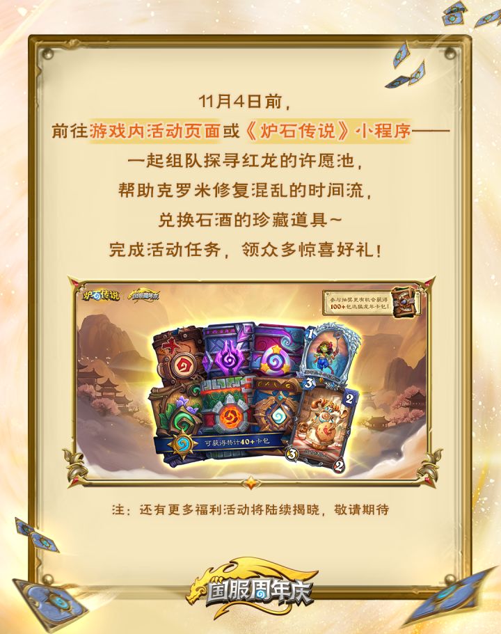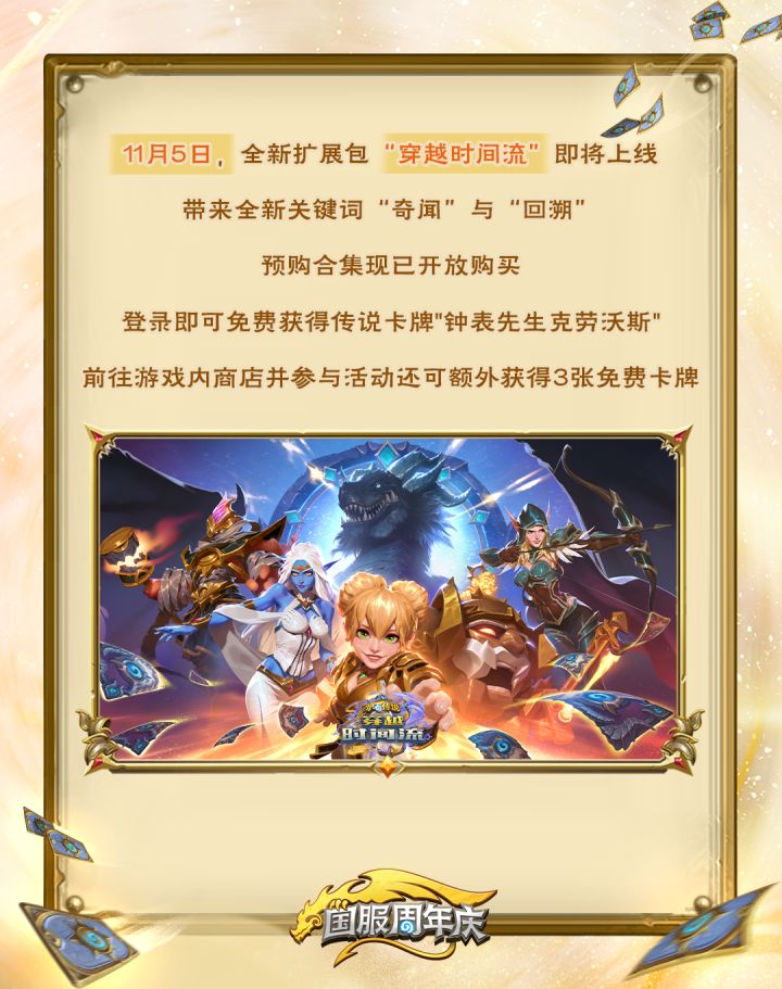 《炉石传说》“穿越时间流”扩展包将于11月5日正式上线,带来145张全新卡牌,2个全新关键词“奇闻”和“回溯”。准备好从过去、未来与平行时间线中的集结史上最强的英雄们。 与青铜龙克罗米并肩作战,阻止姆诺兹多将所有时间流收束于时光之末。召集来自各自时代、拥有独特力量与盟友的11位标志性英雄。 新关键词: 奇闻:这些传说级的英雄人物会在加入套牌时额外加入两张附带的专属传说卡牌 回溯:带有这一关键词的卡