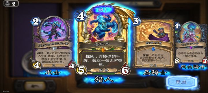 钻石卡末世的姆诺兹多给你两个回合又怎样你没有下个回合了就让你尝尝我钻石卡的厉害只要能回手弃掉的古加尔,利用效果就能将本局弃掉的所有卡回手,包括他自己,而古加尔回手的卡消毫血量而非费用,加上阿迦玛甘使下一张卡消毫对手血量所以You jump,I jump.最后用钻石卡回血续命,扭曲虚空清面板,于是就有这么一套能无限OTK的卡组。