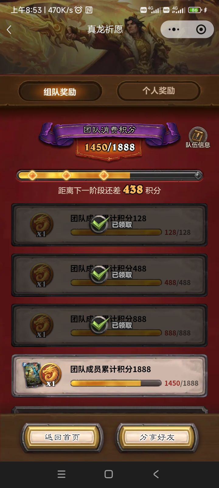 最后差一个128即可完成任务,小钱办大事,加入我的队伍,一起拿标准异画传说卡牌,在真龙祈愿组队大厅搜索我的入队码:TFY4435G