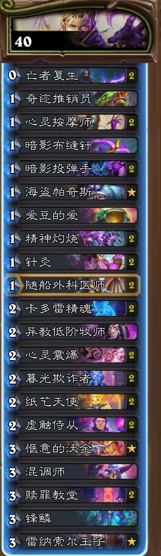 虚灵回调,卡组更新### 新40快# 职业:牧师# 模式:狂野模式## 1x (0) 亡者复生# 1x (1) 奇迹推销员# 2x (1) 心灵按摩师# 2x (1) 暗影投弹手# 1x (1) 海盗帕奇斯# 1x (1) 爱豆的爱# 2x (1) 精神灼烧# 2x (1) 针灸# 2x (1) 随船外科医师# 2x (2) 卡多雷精魂# 1x (2) 异教低阶牧师# 2x (2) 心灵震爆# 1x (2) 暮光欺诈者# 2x (2) 纸艺天使# 2x (2) 虚触侍从# 1x (3) 惬意的沃金# 1x (3) 混调师# 1x (3) 满怀希望的树妖# 1x (3) 灰烬元素# 2x (3) 虚灵神谕者# 2x (3) 赎罪教堂 # 1x (3) 雷纳索尔王子# 1x (4) 乐队经理精英牛头人酋长# 1x (1) 暗影布缝针# 1x (1) 纳鲁碎片# 1x (5) 暗影子嗣# 1x (4) 亮石旋岩虫# 1x (4) 剑圣奥卡尼# 2x (4) 狂暴邪翼蝠# 1x (4) 纳亚克·海克森# 1x (5) 黑暗主教本尼迪塔斯# AAEBAa0GEJG8AtfOA6P3A7v3A4ujBMeyBKfkBJfvBLnEBf3EBYWOBtCeBpigBoa/BtfSBrD1BgyhBJEPurYDrfcDhoMF3aQFyKEGxKgG17oG1cEG5OoGrJQHAAED9xP9xAX08QP9xAWH9wP9xAUAAA==# # 想要使用这副套牌,请先复制到剪贴板,然后在游戏中点击“新套牌”进行粘贴。