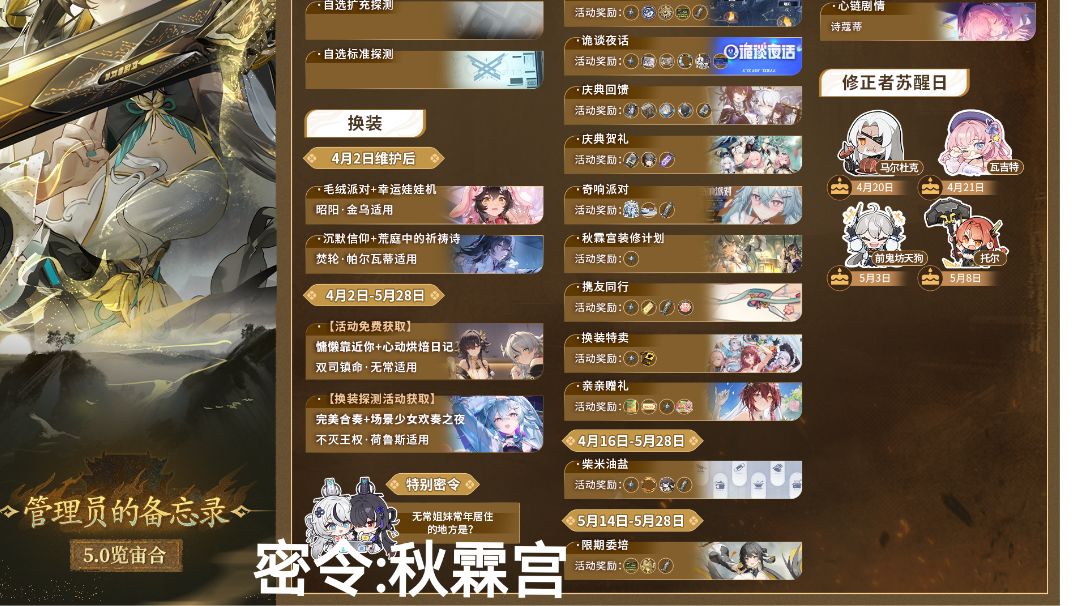 亲爱的管理员好呀! 5.0版本「览宙合」现已开启! 本吨为管理员整理了一份版本活动备忘录,欢迎管理员收藏查阅~ 备忘录里藏了一份小彩蛋,答案即是密令哟~ 领取方式:管理员可以点击游戏内主界面右上方的【菜单】-【兑换礼包】-【输入密令】,即可收到来自吨吨的小礼物啦ヾ(◍°∇°◍)ノ゙