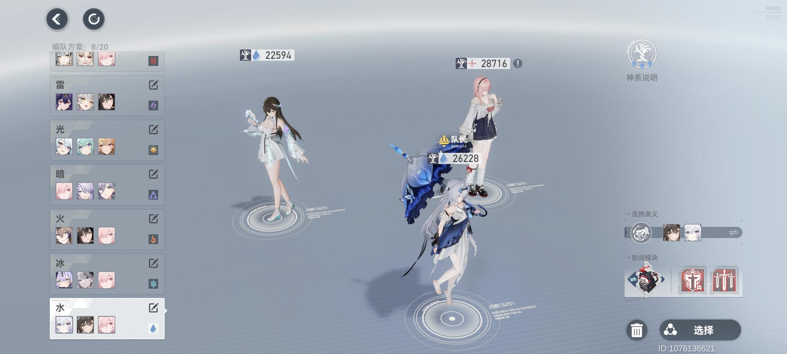 水队:水海拉c+水母+skd 必须三圣树,没skd不行冰队:伊里c+金鱼+skd 必须三冰,没skd不行火队:牛仔c+陵光+skd 等新火c,没skd不行暗队:月神c+剪刀+skd 我缺s困,没skd不行物理队:托特c+狮子+skd 没潜蛇,歪到小提琴不知道强度没去养,也是没skd不行光队:荷c+光奥+光赫拉 赫拉顶替skd风队:梵天c+帕瓦+麟钰雷队:樱切c+神威c+陵光 歪到伽梨