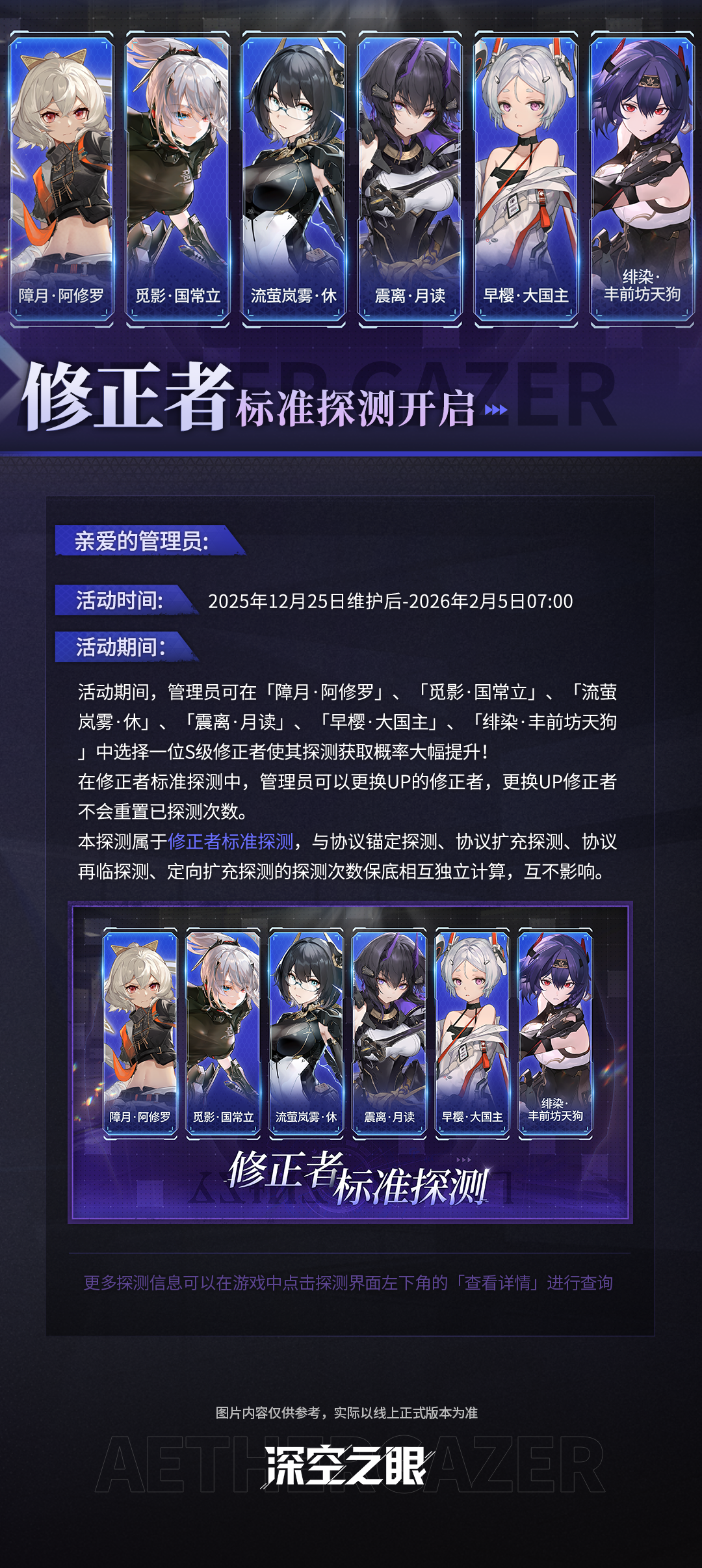 亲爱的管理员好~修正者标准探测即将于12月25日维护更新完成后开启,具体探测信息请看下图!