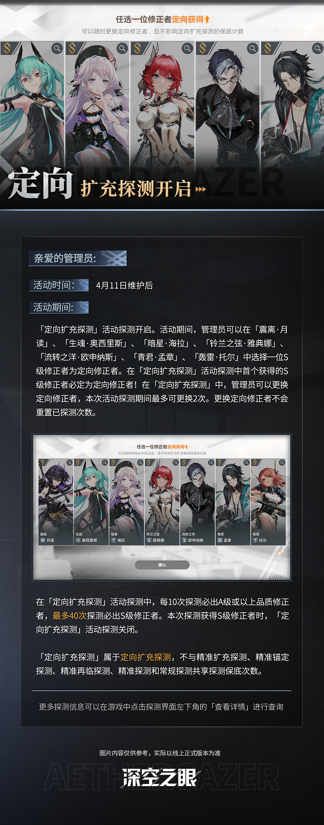 这次抽10返3的活动只适用于黄票,这个常规探测和定向扩充全是黄票的池子,如果黄票多想要补黄票的可以去这次的黄票池子捞想要的角色不管是补辅助还是开芯片都行,千万不要没有看清规则然后傻傻的去垫任何蓝票的池子还有专武池子然后这次pv没有说复刻那些黄票角色,定向扩充这个池子可能有人忘了是啥,新手的那个池子有冥王,海拉的就叫这个名字,至于这次会不会变成自选或者加角色官方啥都没有说,一切以池子预告为准