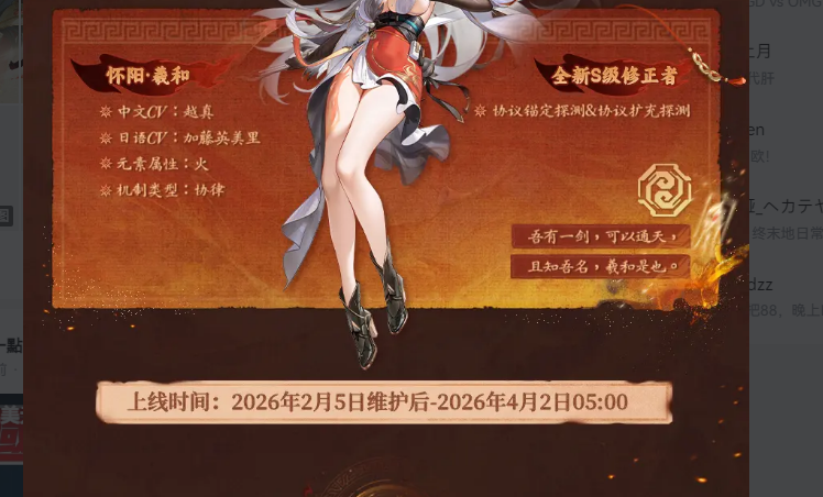 疑似文案错误,卡池4.2号结束,签到3.19号结束,以卡池为准的情况下,本期是56天的超长春节版本,无过渡版本直接进入周年庆版本,也就是说,还有58天的时间,给亲们累计签到,获取320天的签到奖励。月卡、战令的充值折扣会在周年庆进行重置。根据公告的内容,可能以后的常驻卡池都将是自选up模式,而战令则对应常驻修正自选专武。(常驻卡池改版写的是维护后,没有时间范围,所以推测的)