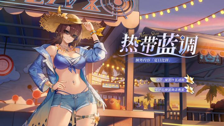 亲爱的管理员好!硝芒·埃克什瓦全新换装「热带蓝调」及额外内容「夏日比拼」现已登场!「椰林飘香?听起来不错。管理员,一起来上一杯!」