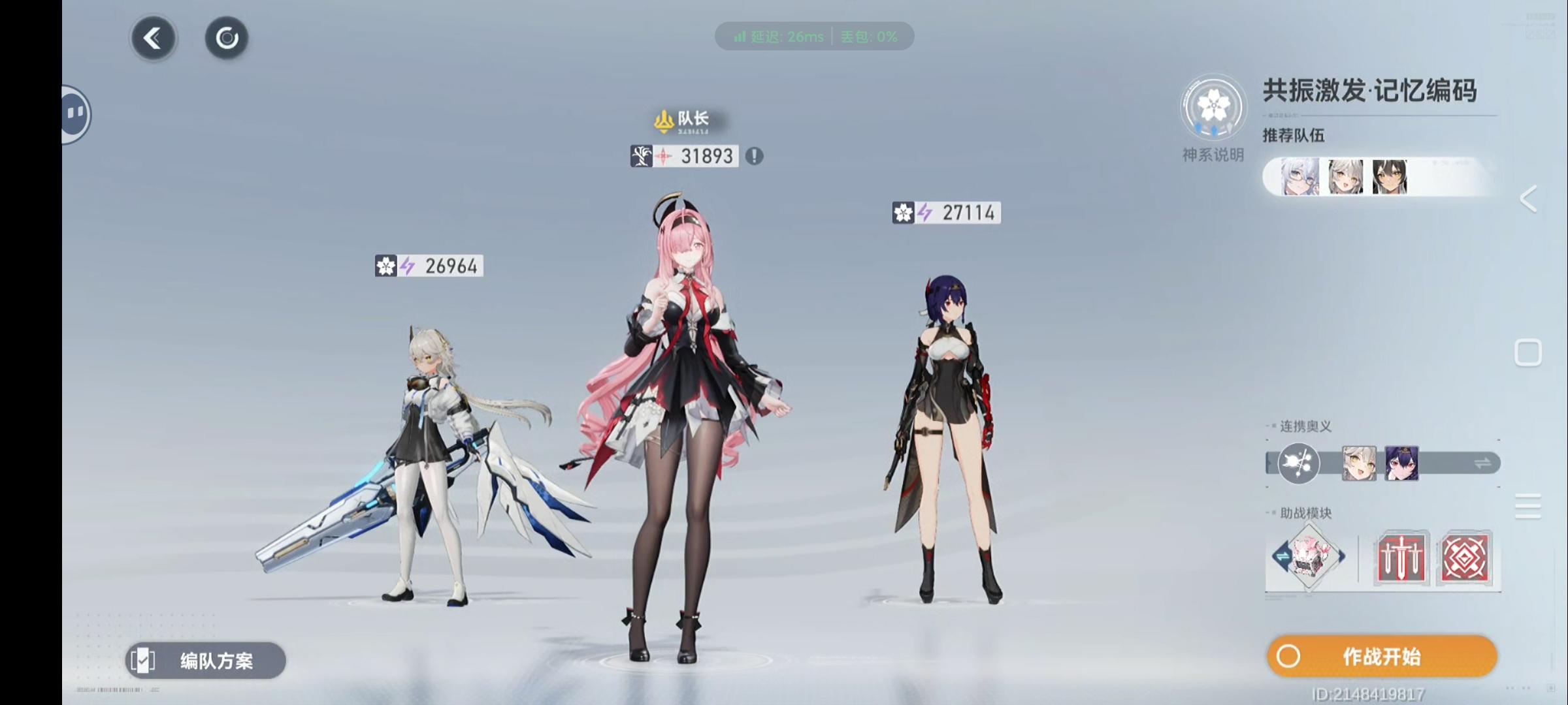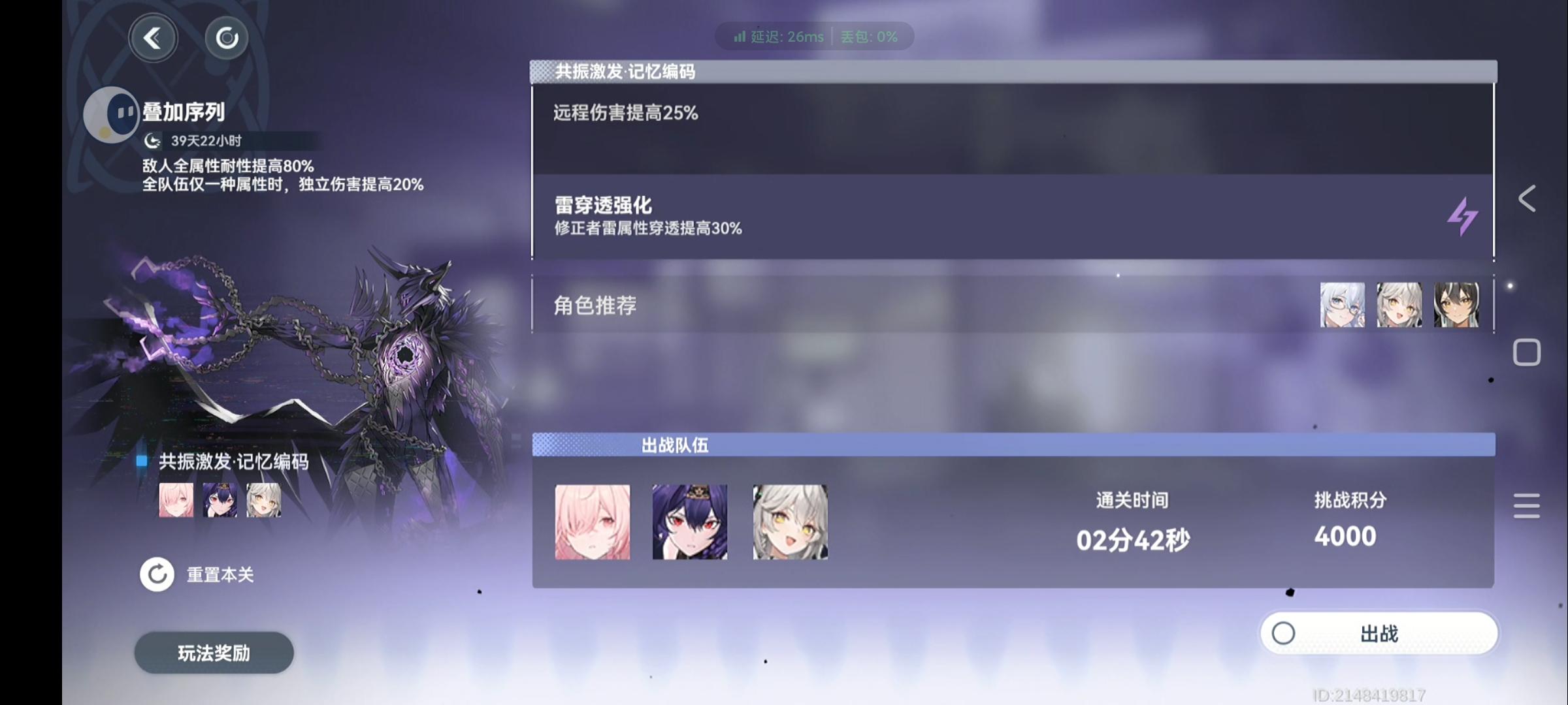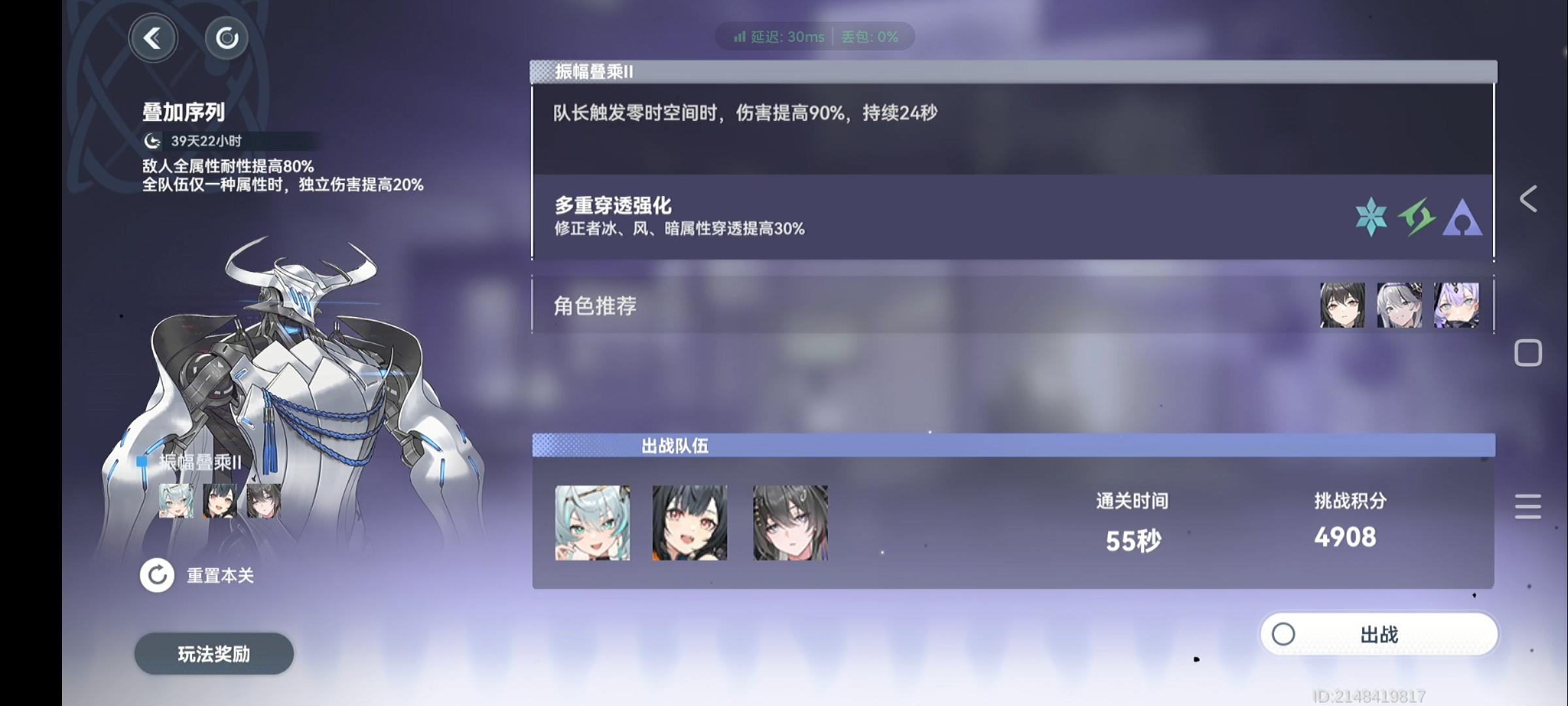 属性队伍没齐不想抽新雷c,绯染2s有专,神威2s无专但是通用的也叠满了,诗蒄蒂3s 2+5,不想手搓绯染就喜欢手搓辅助无脑随便按按就行。打了三次才过,第一次模块带托尔打到一半绯染暴毙了,第二次就是上面的阵容了结果BOSS还差1%血没死,在重新打一次就上面的结果了。风队依旧强势,全员单s,就辅助有专,手搓副c,玩起来这副c比风辅更无脑。